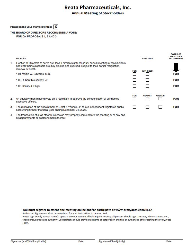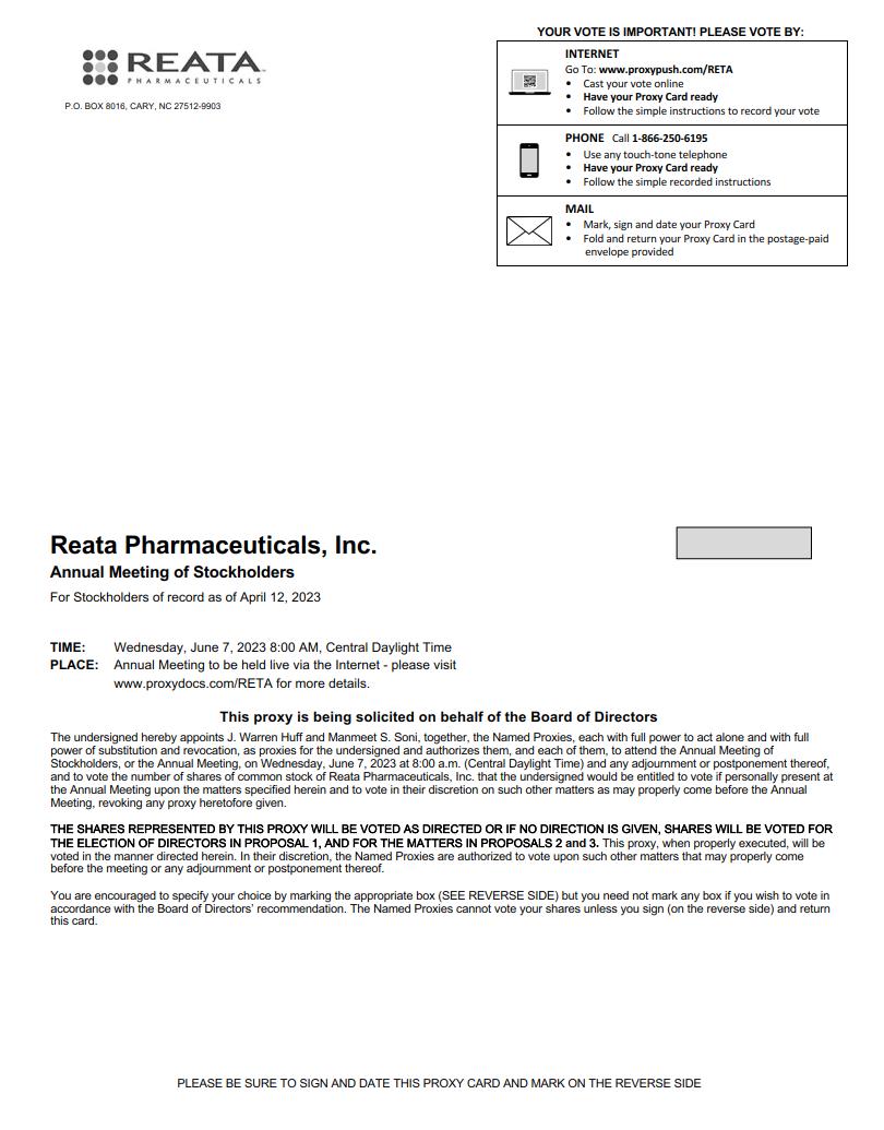 REATA PHARMACEUTIALS P.O. BOX 8016, CARY, NC 27512-9903 YOUR VOTE IS IMPORTANT! PLEASE VOTE BY: Graphic INTERNET Go To www.proxypush.com/RETA Cast your vote online Have your Proxy Card ready Follow the simple instructions to record your vote Graphic PHONE Call 1-866-250-6195 Use any touch tone telephone Have your proxy Card ready Follow the simple recorded instructions Graphic MAIL Mark, sign and date your Proxy Card Fold and return your Proxy Card in the postage-paid envelope provided Reata Pharmaceuticals, Inc. Annual Meeting of Stockholders For Stockholders of record as of April 13, 2022 TIME: Wednesday, June 8, 2022 8:00 AM, Central Daylight Time PLACE: Annual Meeting to be held live via the Internet: Please visit www.proxydocs.com/RETA for more details. This proxy is being solicited on behalf of the Board of Directors The undersigned hereby appoints J. Warren Huff and Manmeet S. Soni, together, the Named Proxies, each with full power to act alone and with full power of substitution and revocation, as proxies for the undersigned and authorizes them, and each of them, to attend the Annual Meeting of Stockholders, or the Annual Meeting, on Wednesday, June 8, 2022 at 8:00 a.m. (Central Daylight Time) and any adjournment or postponement thereof, and to vote the number of shares of common stock of Reata Pharmaceuticals, Inc. that the undersigned would be entitled to vote if personally present at Meeting, revoking any proxy heretofore given. THE SHARES REPRESENTED BY THIS PROXY WILL BE VOTED AS DIRECTED OR IF NO DIRECTION IS GIVEN, SHARES WILL BE VOTED FOR THE ELECTION OF DIRECTORS IN PROPOSAL 1, AND FOR THE MATTERS IN PROPOSALS 2, 3 AND 4. This proxy, when properly executed, will be voted in the manner directed herein. In their discretion, the Named Proxies are authorized to vote upon such other matters that may properly come before the meeting or any adjournment or postponement thereof. You are encouraged to specify your choice by marking the appropriate box (SEE REVERSE SIDE) but you need not mark any box if you wish to vote in accordance with the Board of Directors’ recommendation. The Named Proxies cannot vote your shares unless you sign (on the reverse side) and return this card. PLEASE BE SURE TO SIGN AND DATE THIS PROXY CARD AND MARK ON THE REVERSE SI