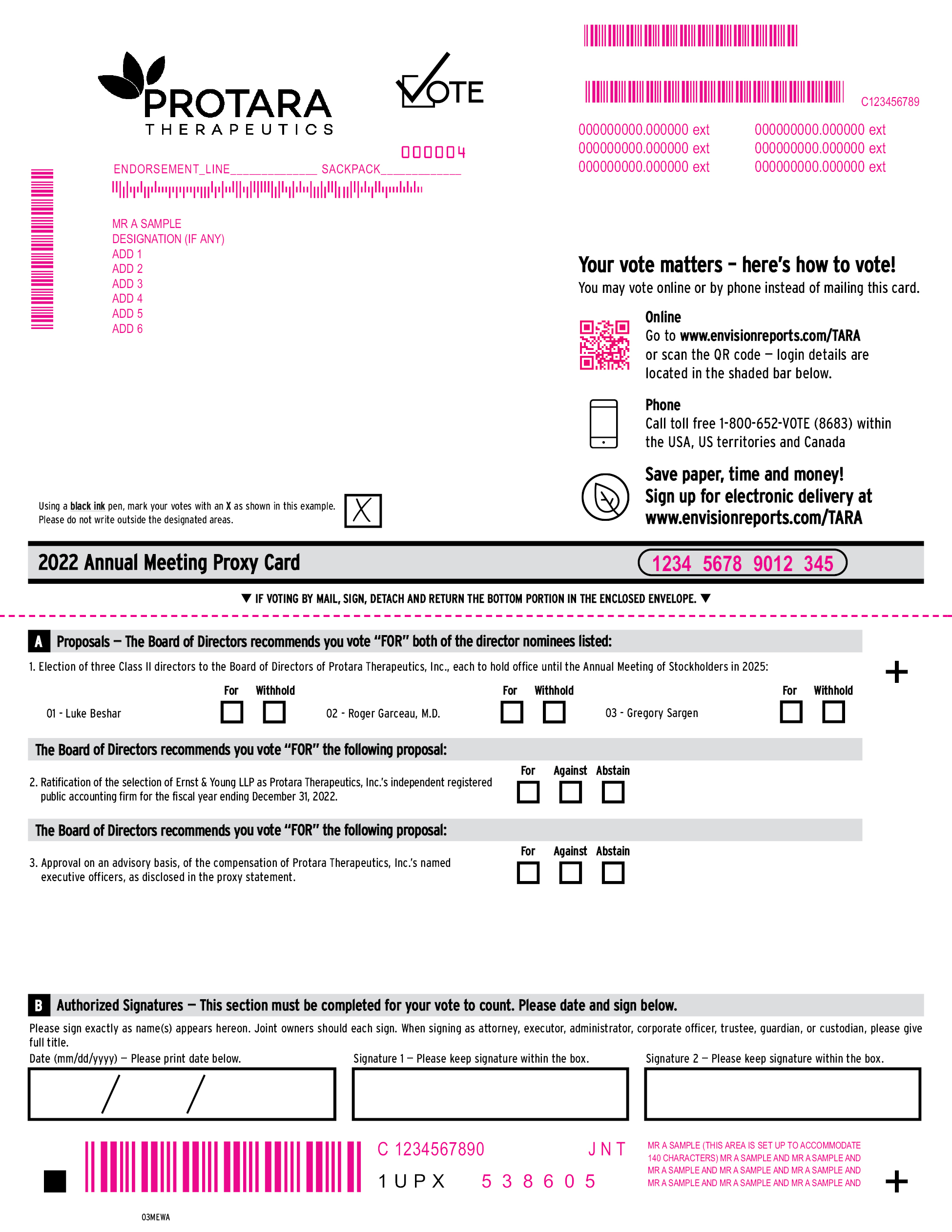 C123456789 000004 ENDORSEMENT LINE SACKPACK 000000000.000000 ext 000000000.000000 ext 000000000.000000 ext 000000000.000000 ext 000000000.000000 ext 000000000.000000 ext MR A SAMPLE DESIGNATION (IF ANY) ADD 1 ADD 2 ADD 3 ADD 4 ADD 5 ADD 6 Using a black ink pen, mark your votes with an X as shown in this example. Please do not write outside the designated areas. Your vote matters – here’s how to vote! You may vote online or by phone instead of mailing this card. Online Go to www.envisionreports.com/TARA or scan the QR code — login details are located in the shaded bar below. Phone Call toll free 1-800-652-VOTE (8683) within the USA, US territories and Canada Save paper, time and money! Sign up for electronic delivery at www.envisionreports.com/TARA IF VOTING BY MAIL, SIGN, DETACH AND RETURN THE BOTTOM PORTION IN THE ENCLOSED ENVELOPE. Proposals — The Board of Directors recommends you vote “FOR” both of the director nominees listed: 1. Election of three Class II directors to the Board of Directors of Protara Therapeutics, Inc., each to hold office until the Annual Meeting of Stockholders in 2025: For Withhold For Withhold 01 - Luke Beshar 02 - Roger Garceau, M.D. 03 - Gregory Sargen For Withhold The Board of Directors recommends you vote “FOR” the following proposal: For Against Abstain 2. Ratification of the selection of Ernst & Young LLP as Protara Therapeutics, Inc.’s independent registered public accounting firm for the fiscal year ending December 31, 2022. The Board of Directors recommends you vote “FOR” the following proposal: For Against Abstain 3. Approval on an advisory basis, of the compensation of Protara Therapeutics, Inc.’s named executive officers, as disclosed in the proxy statement. Authorized Signatures — This section must be completed for your vote to count. Please date and sign below. Please sign exactly as name(s) appears hereon. Joint owners should each sign. When signing as attorney, executor, administrator, corporate officer, trustee, guardian, or custodian, please give full title. Date (mm/dd/yyyy) — Please print date below. Signature 1 — Please keep signature within the box. Signature 2 — Please keep signature within the box. C 1234567890 J N T 1 U P X 5 3 8 6 0 5 MR A SAMPLE (THIS AREA IS SET UP TO ACCOMMODATE 140 CHARACTERS) MR A SAMPLE AND MR A SAMPLE AND MR A SAMPLE AND MR A SAMPLE AND MR A SAMPLE AND MR A SAMPLE AND MR A SAMPLE AND MR A SAMPLE AND 03MEWA