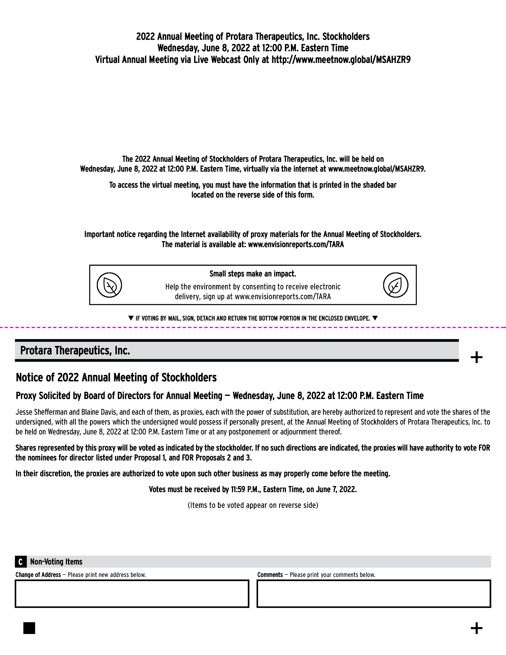 2022 Annual Meeting of Protara Therapeutics, Inc. Stockholders Wednesday, June 8, 2022 at 12:00 P.M. Eastern Time Virtual Annual Meeting via Live Webcast Only at http://www.meetnow.global/MSAHZR9 The 2022 Annual Meeting of Stockholders of Protara Therapeutics, Inc. will be held on Wednesday, June 8, 2022 at 12:00 P.M. Eastern Time, virtually via the internet at www.meetnow.global/MSAHZR9. To access the virtual meeting, you must have the information that is printed in the shaded bar located on the reverse side of this form. Important notice regarding the Internet availability of proxy materials for the Annual Meeting of Stockholders. The material is available at: www.envisionreports.com/TARA IF VOTING BY MAIL, SIGN, DETACH AND RETURN THE BOTTOM PORTION IN THE ENCLOSED ENVELOPE. + Notice of 2022 Annual Meeting of Stockholders Proxy Solicited by Board of Directors for Annual Meeting — Wednesday, June 8, 2022 at 12:00 P.M. Eastern Time Jesse Shefferman and Blaine Davis, and each of them, as proxies, each with the power of substitution, are hereby authorized to represent and vote the shares of the undersigned, with all the powers which the undersigned would possess if personally present, at the Annual Meeting of Stockholders of Protara Therapeutics, Inc. to be held on Wednesday, June 8, 2022 at 12:00 P.M. Eastern Time or at any postponement or adjournment thereof. Shares represented by this proxy will be voted as indicated by the stockholder. If no such directions are indicated, the proxies will have authority to vote FOR the nominees for director listed under Proposal 1, and FOR Proposals 2 and 3. In their discretion, the proxies are authorized to vote upon such other business as may properly come before the meeting. Votes must be received by 11:59 P.M., Eastern Time, on June 7, 2022. (Items to be voted appear on reverse side) Change of Address — Please print new address below. Comments — Please print your comments below. +