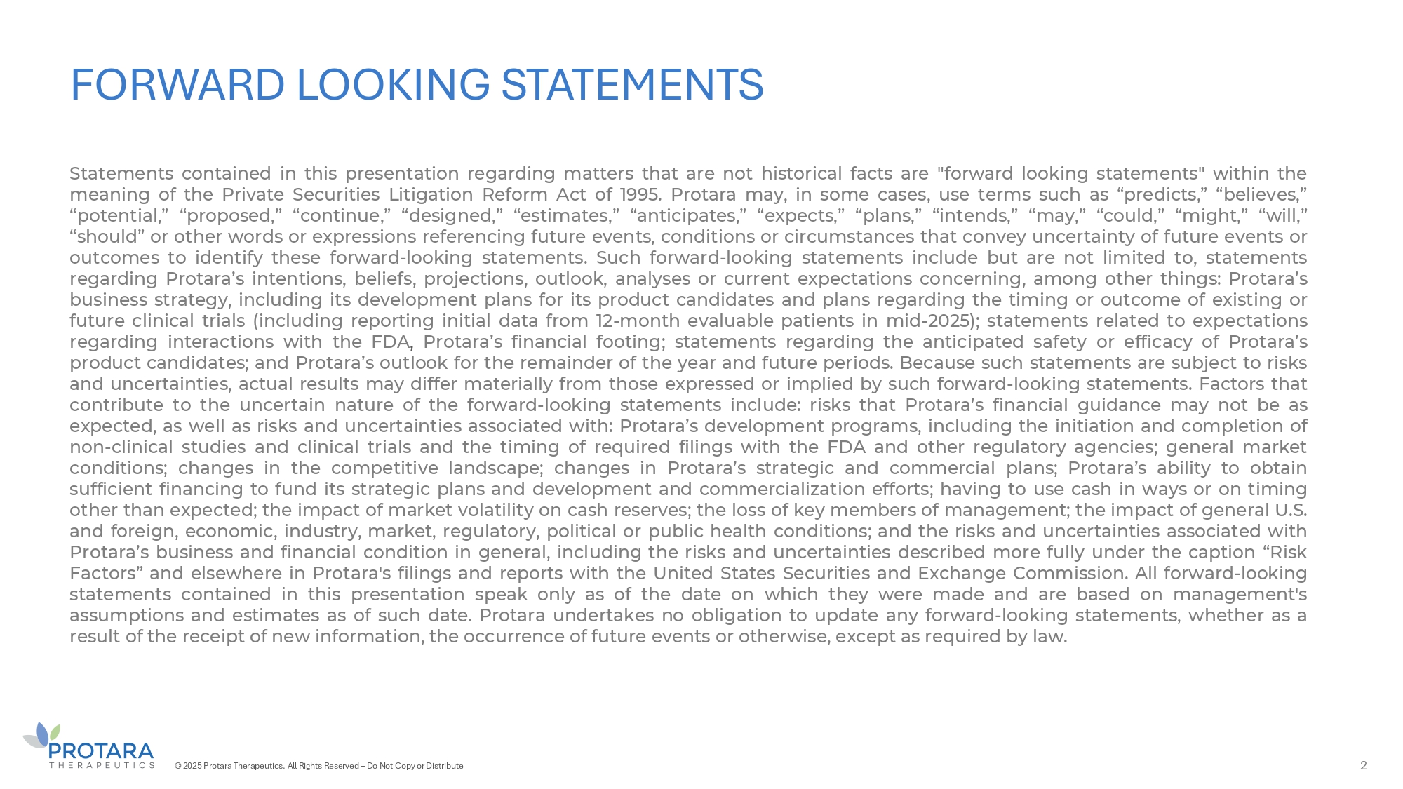 FORWARD LOOKING STATEMENTS 2 © 2025 Protara Therapeutics. All Rights Reserved – Do Not Copy or Distribute Statements contained in this presentation regarding matters that are not historical facts are "forward looking statements" within the meaning of the Private Securities Litigation Reform Act of 1995 . Protara may, in some cases, use terms such as “predicts,” “believes,” “potential,” “proposed,” “continue,” “designed,” “estimates,” “anticipates,” “expects,” “plans,” “intends,” “may,” “could,” “might,” “will,” “should” or other words or expressions referencing future events, conditions or circumstances that convey uncertainty of future events or outcomes to identify these forward - looking statements . Such forward - looking statements include but are not limited to, statements regarding Protara’s intentions, beliefs, projections, outlook, analyses or current expectations concerning, among other things : Protara’s business strategy, including its development plans for its product candidates and plans regarding the timing or outcome of existing or future clinical trials (including reporting initial data from 12 - month evaluable patients in mid - 2025 ) ; statements related to expectations regarding interactions with the FDA , Protara’s financial footing ; statements regarding the anticipated safety or efficacy of Protara’s product candidates ; and Protara’s outlook for the remainder of the year and future periods . Because such statements are subject to risks and uncertainties, actual results may differ materially from those expressed or implied by such forward - looking statements . Factors that contribute to the uncertain nature of the forward - looking statements include : risks that Protara’s financial guidance may not be as expected, as well as risks and uncertainties associated with : Protara’s development programs, including the initiation and completion of non - clinical studies and clinical trials and the timing of required filings with the FDA and other regulatory agencies ; general market conditions ; changes in the competitive landscape ; changes in Protara’s strategic and commercial plans ; Protara’s ability to obtain sufficient financing to fund its strategic plans and development and commercialization efforts ; having to use cash in ways or on timing other than expected ; the impact of market volatility on cash reserves ; the loss of key members of management ; the impact of general U . S . and foreign, economic, industry, market, regulatory, political or public health conditions ; and the risks and uncertainties associated with Protara’s business and financial condition in general, including the risks and uncertainties described more fully under the caption “Risk Factors” and elsewhere in Protara's filings and reports with the United States Securities and Exchange Commission . All forward - looking statements contained in this presentation speak only as of the date on which they were made and are based on management's assumptions and estimates as of such date . Protara undertakes no obligation to update any forward - looking statements, whether as a result of the receipt of new information, the occurrence of future events or otherwise, except as required by law .