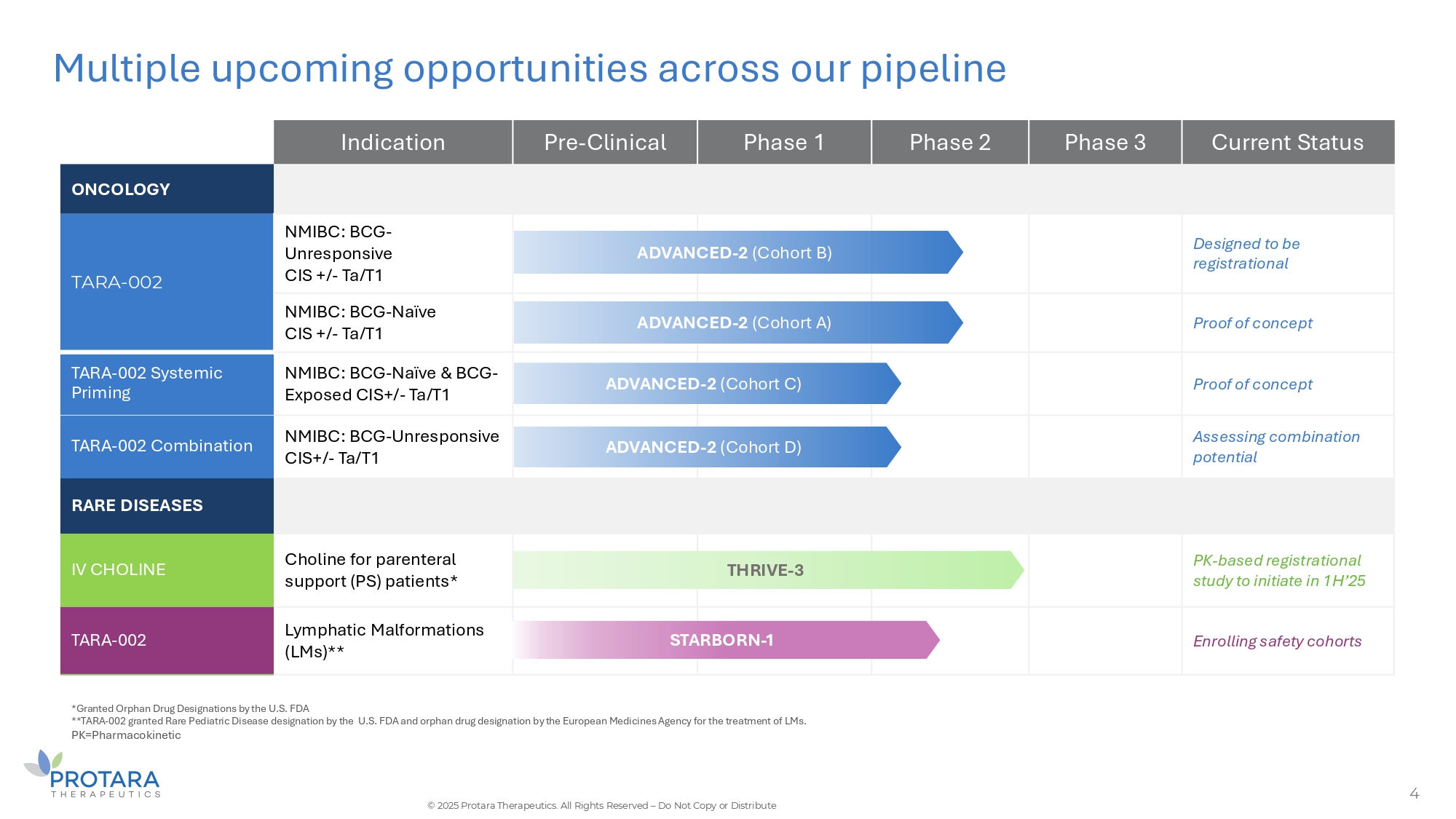 Promising NMIBC therapy C de - risked rare disease programs TARA - 002 in NMIBC • Dosing underway in Phase 2 STARBORN - 1 trial • TARA - 002 predecessor is standard of care in Japan • U.S. FDA granted Rare Pediatric Disease Designation – PRV eligible • Positive interim results from ADVANCED - 2 trial in NMIBC • Unique product characteristics anticipated to drive significant adoption • Expanding clinical program into BCG - naïve, combinations and systemic priming dosing Oncology Rare Disease TARA - 002 in LMs IV Choline for Parenteral Support • Enrolling pivotal study with PK endpoint • 30K patient population in the US 1 3 © 2025 Protara Therapeutics. All Rights Reserved – Do Not Copy or Distribute • FDA Orphan Drug and Fast Track Designations 1. Data on file