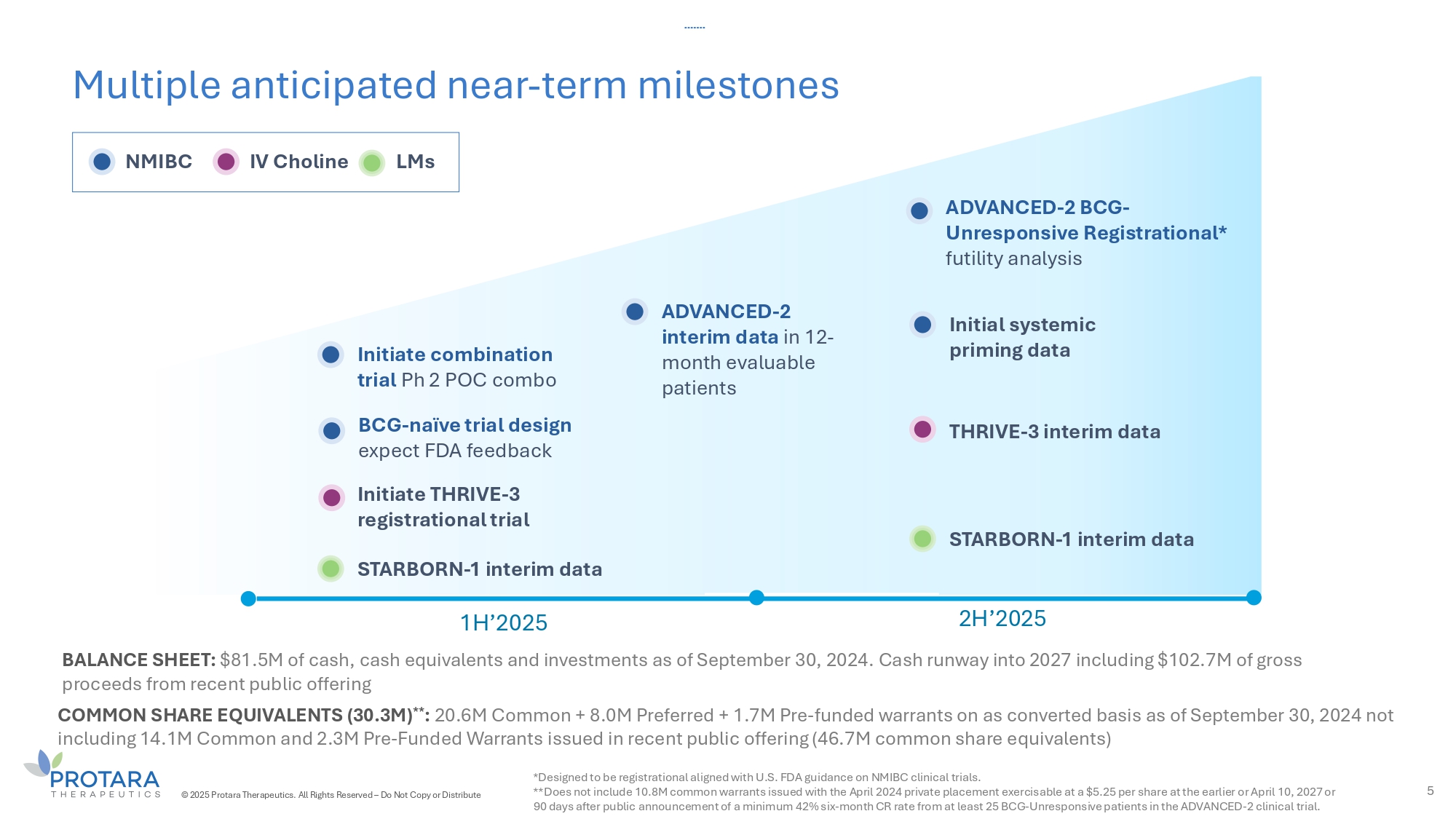 Multiple upcoming opportunities across our pipeline 4 *Granted Orphan Drug Designations by the U.S. FDA **TARA - 002 granted Rare Pediatric Disease designation by the U.S. FDA and orphan drug designation by the European Medicines Agency for the treatment of LMs. PK=Pharmacokinetic © 2025 Protara Therapeutics. All Rights Reserved – Do Not Copy or Distribute Current Status Phase 3 Phase 2 Phase 1 Pre - Clinical Indication ONCOLOGY Designed to be registrational ED - 2 (Cohort B) ADVANC NMIBC: BCG - Unresponsive CIS +/ - Ta/T1 TARA - 002 Proof of concept ED - 2 (Cohort A) ADVANC NMIBC: BCG - Naïve CIS +/ - Ta/T1 Proof of concept - 2 (Cohort C) ADVANCED NMIBC: BCG - Naïve C BCG - Exposed CIS+/ - Ta/T1 TARA - 002 Systemic Priming Assessing combination potential - 2 (Cohort D) ADVANCED NMIBC: BCG - Unresponsive CIS+/ - Ta/T1 TARA - 002 Combination RARE DISEASES PK - based registrational study to initiate in 1H’25 THRIVE - 3 Choline for parenteral support (PS) patients* IV CHOLINE Enrolling safety cohorts RBORN - 1 STA Lymphatic Malformations (LMs)** TARA - 002
