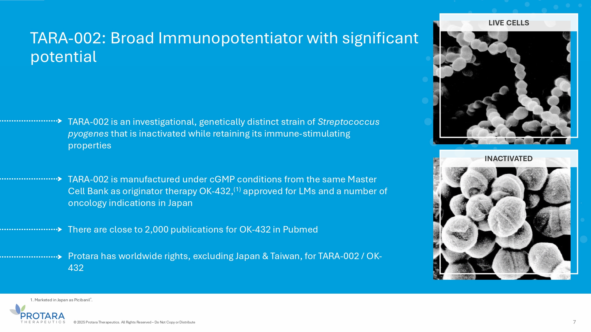 7 TARA - 002: Broad Immunopotentiator with significant potential TARA - 002 is an investigational, genetically distinct strain of Streptococcus pyogenes that is inactivated while retaining its immune - stimulating properties TARA - 002 is manufactured under cGMP conditions from the same Master Cell Bank as originator therapy OK - 432, (1) approved for LMs and a number of oncology indications in Japan There are close to 2,000 publications for OK - 432 in Pubmed Protara has worldwide rights, excluding Japan C Taiwan, for TARA - 002 / OK - 432 1. Marketed in Japan as Picibanil ® . LIVE CELLS INACTIVATED © 2025 Protara Therapeutics. All Rights Reserved – Do Not Copy or Distribute