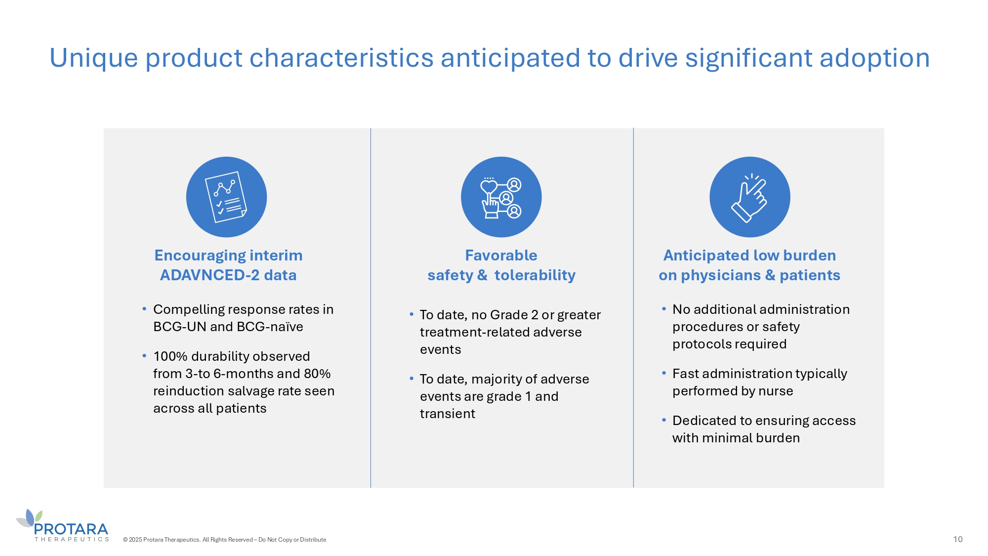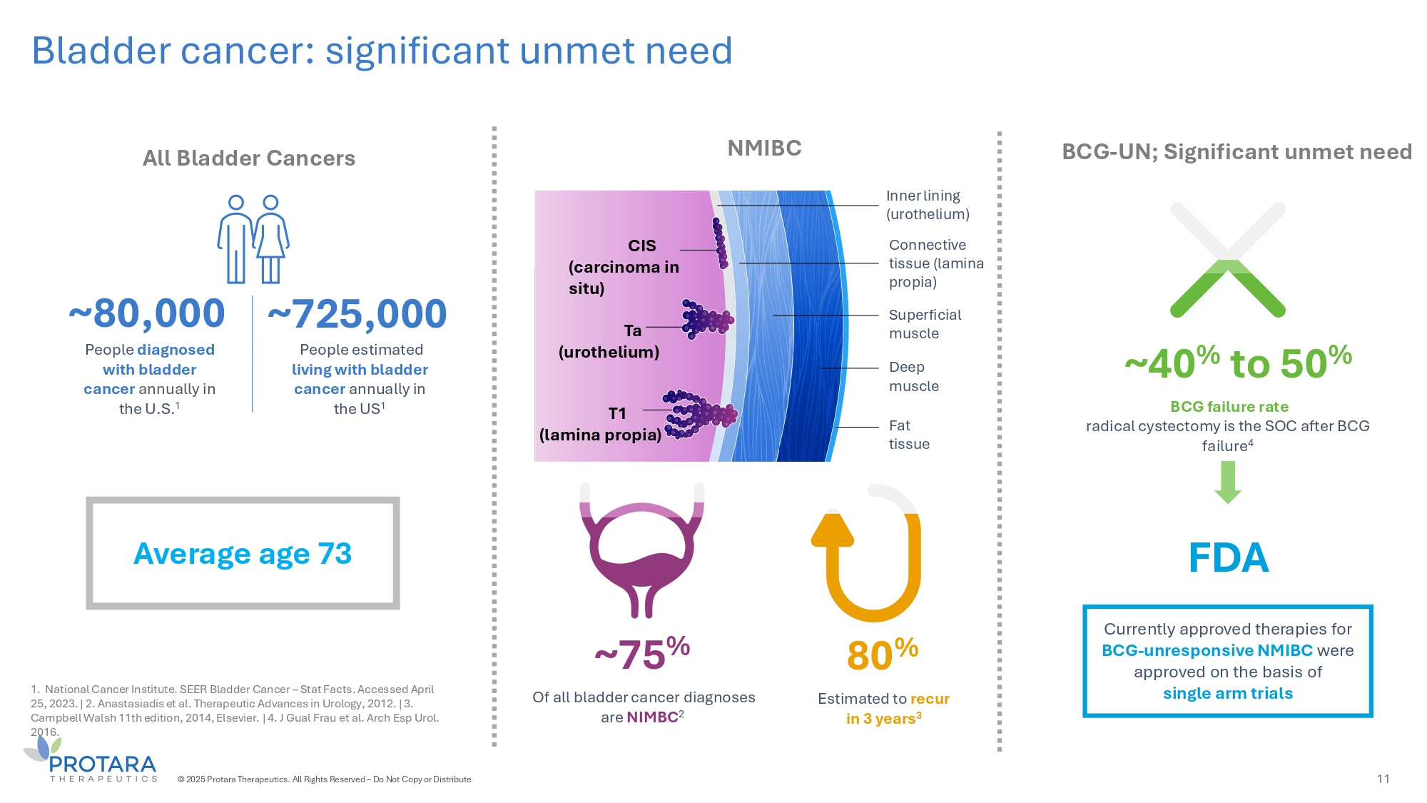 Anticipated low burden on physicians G patients Favorable safety G tolerability Encouraging interim ADAVNCED - 2 data • No additional administration procedures or safety protocols required • Fast administration typically performed by nurse • Dedicated to ensuring access with minimal burden • To date, no Grade 2 or greater treatment - related adverse events • To date, majority of adverse events are grade 1 and transient • Compelling response rates in BCG - UN and BCG - naïve • 100% durability observed from 3 - to 6 - months and 80% reinduction salvage rate seen across all patients Unique product characteristics anticipated to drive significant adoption 10 © 2025 Protara Therapeutics. All Rights Reserved – Do Not Copy or Distribute
