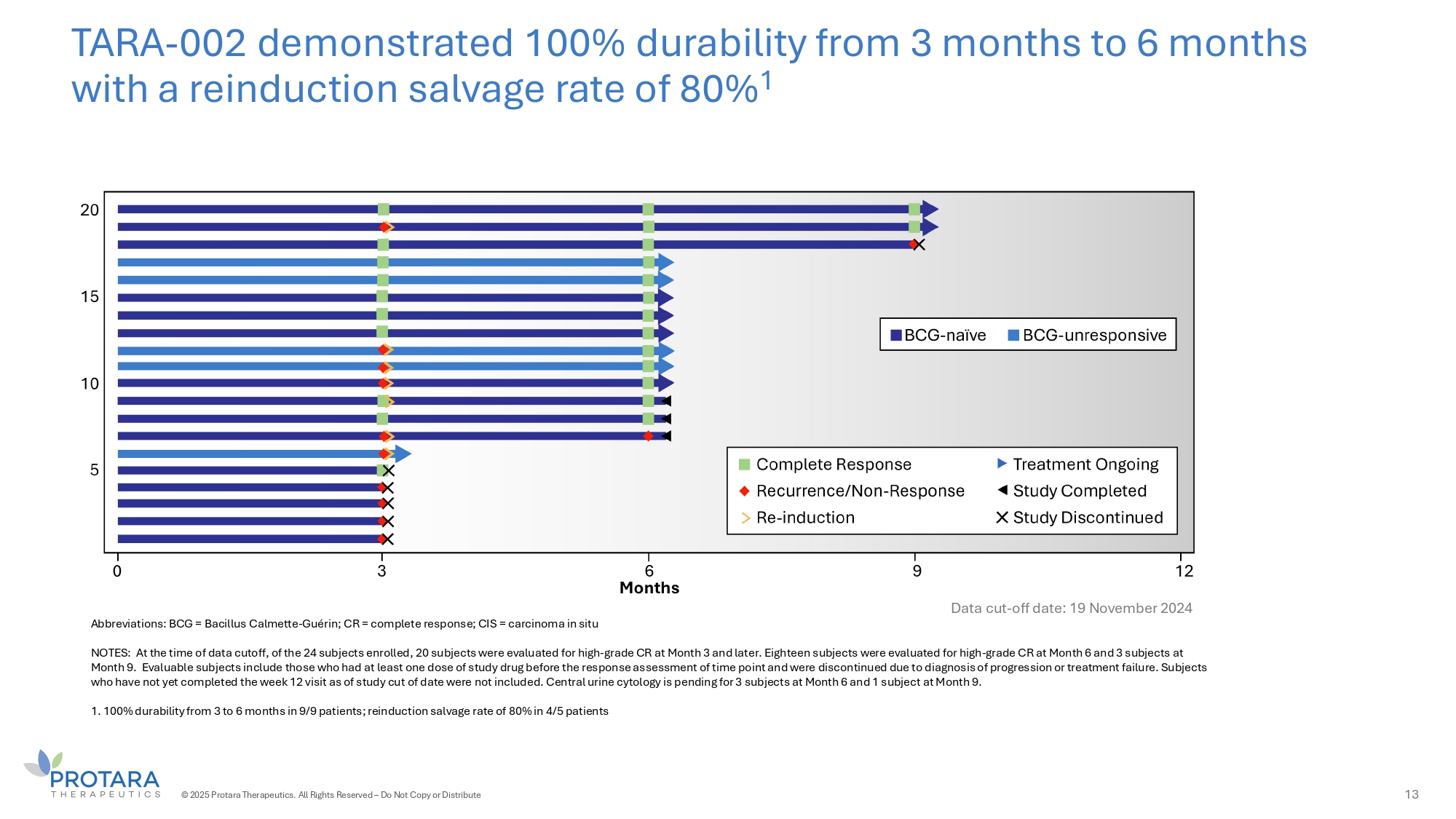 TARA - 002 demonstrated 72% six - month CRR and 70% CRR at any time across BCG exposures BCG Unresponsive 12 © 2025 Protara Therapeutics. All Rights Reserved – Do Not Copy or Distribute BCG Naïve Combined Combined BCG Naïve BCG Un - responsive High - grade CR at Month 6 100 100% 80 72% 60 64% 40 20 0 N = 18 High - grade CR at any time 100 80 80% 70% 60 67% 40 20 0 N = 20 N = 20 N = 15 N = 5 (%) (%) (%) 14/20 (70.0) 10/15 (66.7) 4/5 (80.0) High - grade CR at any time High - grade CR at Timepoint 13/18 (72.2) 9/14 (64.3) 4/4 (100.0) Month 6 2/3 (66.7) 2/3 (66.7) N/A Month 9 High - grade CR at Month 6 by Baseline Dx 9/10 (90.0) 5/6 (83.3) 4/4 (100.0) CIS only 4/8 (50.0) 4/8 (50.0) N/A CIS + Ta/T1 Data cut - off date: 19 November 2024 Abbreviations: BCG = Bacillus Calmette - Guérin; CR = complete response; CIS = carcinoma in situ; Dx = diagnosis; NMIBC = non - muscle invasive bladder cancer Notes: At the time of data cutoff, 20 subjects were evaluated for high - grade CR at Month 3 and later. Eighteen subjects were evaluated for high - grade CR at Month 6 and 3 subjects at Month 9; Evaluable subjects include those who had at least one dose of study drug before the response assessment of time point and were discontinued due to dx progression or treatment failure. Subjects who have not yet completed week 12 visit as of study cut off date are not included; Central urine cytology is pending for 3 subjects at Month 6 and 1 subject at Month 9.