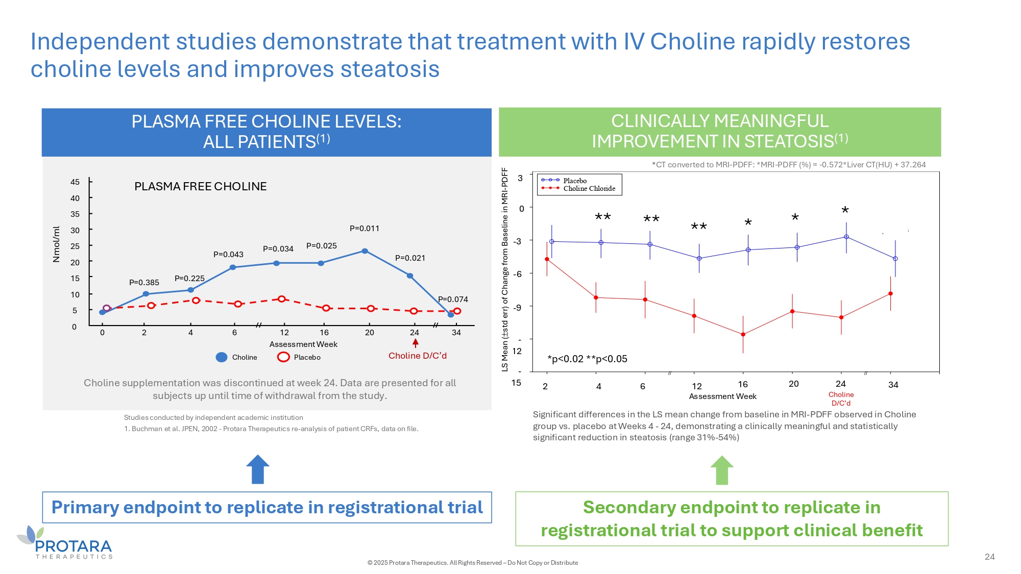 Independent studies demonstrate that treatment with IV Choline rapidly restores choline levels and improves steatosis PLASMA FREE CHOLINE LEVELS: ALL PATIENTS (1) Choline supplementation was discontinued at week 24. Data are presented for all subjects up until time of withdrawal from the study. PLASMA FREE CHOLINE Nmol/ml Choline D/C’d 0 2 4 6 20 24 34 P=0.225 P=0.043 P=0.034 P=0.025 P=0.011 P=0.021 P=0.074 45 40 35 30 25 20 15 10 5 0 Choline 12 16 Assessment Week Placebo // // CLINICALLY MEANINGFUL IMPROVEMENT IN STEATOSIS (1) P=0.385 Studies conducted by independent academic institution 1. Buchman et al. JPEN, 2002 - Protara Therapeutics re - analysis of patient CRFs, data on file. Choline D/C'd Assessment Week S Means tderr) ange aseli L (+/ - s of ch from B ne of MRI p= 0.4770 p= 0.0197 p= 0.0312 p= 0.0180 p= 0.0014 p= 0.0091 p= 0.0021 p= 0.1823 // // - 15 - 12 - 9 - 6 - 3 0 3 2 4 6 12 16 20 24 34 Placebo Choline Chloride * * * ** ** ** - 3 3 0 - 6 - 9 - 2 1 - 15 Assessment Week *p<0.02 **p<0.05 2 4 6 12 16 20 Choline D/C’d 34 24 Significant differences in the LS mean change from baseline in MRI - PDFF observed in Choline group vs. placebo at Weeks 4 - 24, demonstrating a clinically meaningful and statistically significant reduction in steatosis (range 31% - 54%) * CT converted to MRI - PDFF: *MRI - PDFF (%) = - 0.572*Liver CT(HU) + 37.264 LS Mean ( std err) of Change from Baseline in M - PD R F I - F PDFF Primary endpoint to replicate in registrational trial Secondary endpoint to replicate in registrational trial to support clinical benefit 24 © 2025 Protara Therapeutics. All Rights Reserved – Do Not Copy or Distribute
