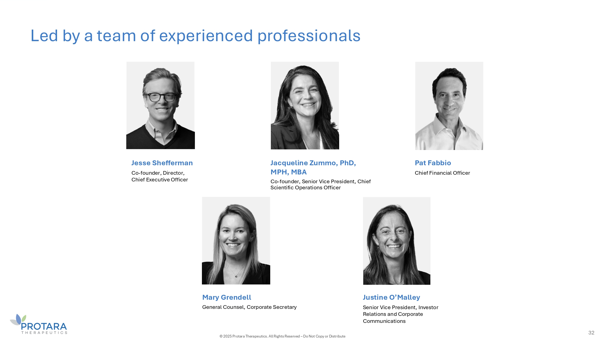 Led by a team of experienced professionals Jesse Shefferman Co - founder, Director, Chief Executive Officer Pat Fabbio Chief Financial Officer Jacqueline Zummo, PhD, MPH, MBA Co - founder, Senior Vice President, Chief Scientific Operations Officer Justine O’Malley Senior Vice President, Investor Relations and Corporate Communications Mary Grendell General Counsel, Corporate Secretary 32 © 2025 Protara Therapeutics. All Rights Reserved – Do Not Copy or Distribute