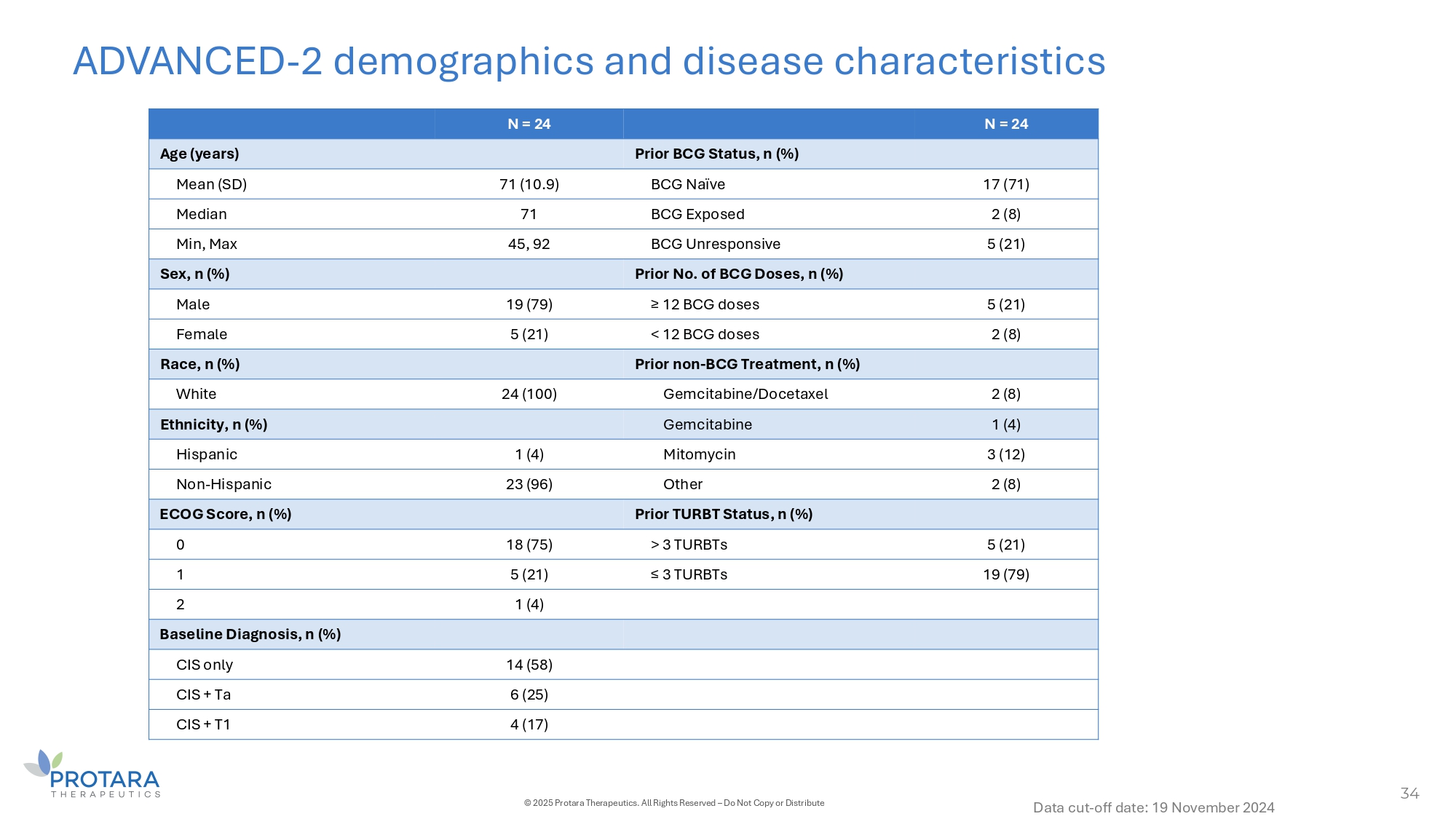 TARA - 002 in NMIBC: ADVANCED - 2 clinical trial design RE - induction (if eligible*) Maintenance (months 6 - 18) Month 3 Month 6 Month 18 Month 60 Maintenance (months 6 - 18) Month 18 Protara Confidential Information Data cut - off date: 19 November 2024 33 © 2025 Protara Therapeutics. All Rights Reserved – Do Not Copy or Distribute Month 60 Month 3 Month 6 Abbreviations: CR = complete response; CIS = carcinoma in situ *Aligned with the FDA’s 2024 BCG Unresponsive NMIBC: Developing Drugs and Biologics for Treatment Guidance for Industry. †Residual CIS and/or recurrence of HGTa Primary endpoint of high - grade complete response (CR) at any time at 6 months; Key secondary of 12 - month DOR
