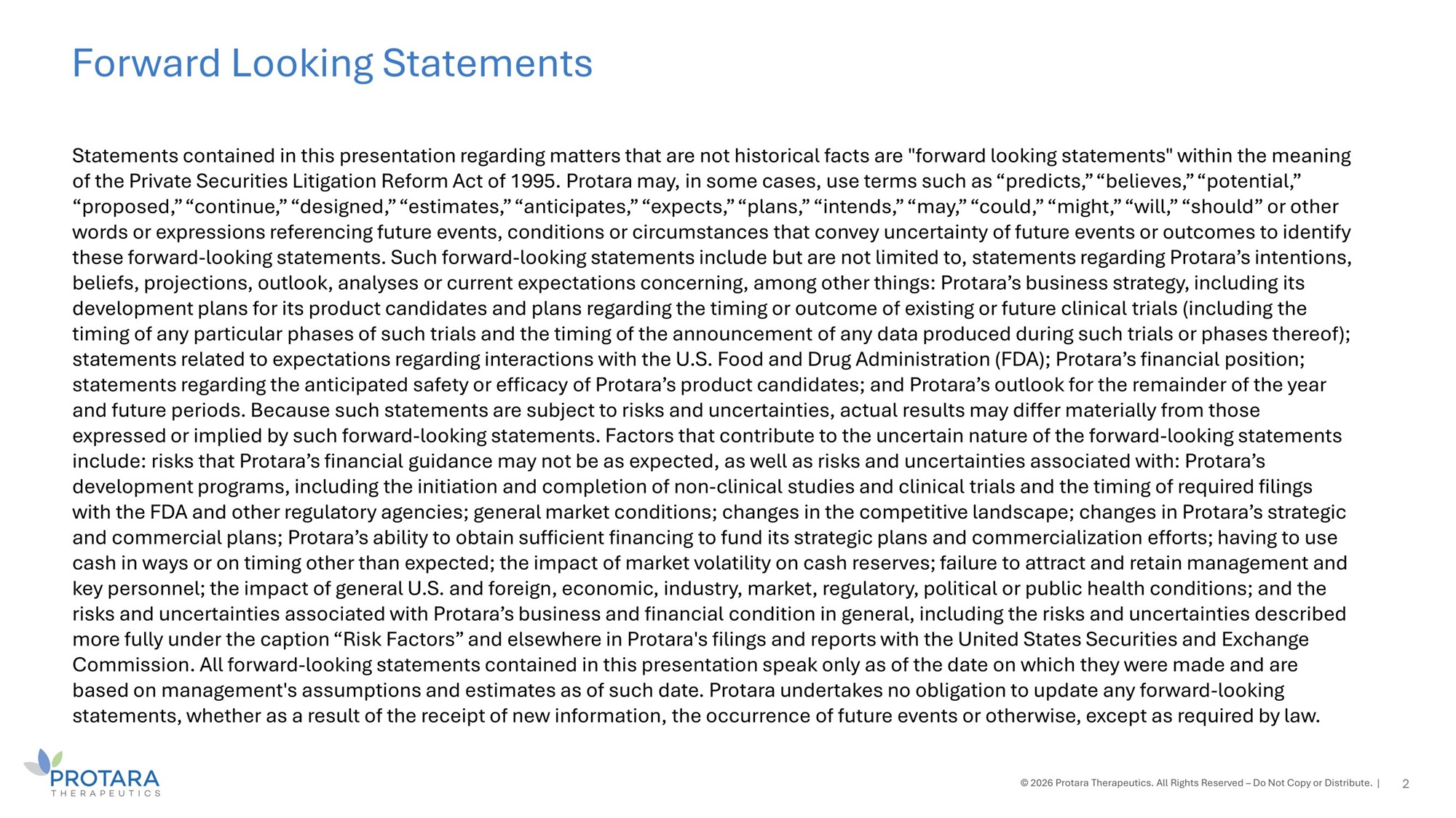 2 Statements contained in this presentation regarding matters that are not historical facts are "forward looking statements" within the meaning of the Private Securities Litigation Reform Act of 1995. Protara may, in some cases, use terms such as “predicts,” “believes,” “potential,” “proposed,” “continue,” “designed,” “estimates,” “anticipates,” “expects,” “plans,” “intends,” “may,” “could,” “might,” “will,” “should” or other words or expressions referencing future events, conditions or circumstances that convey uncertainty of future events or outcomes to identify these forward - looking statements. Such forward - looking statements include but are not limited to, statements regarding Protara’s intentions, beliefs, projections, outlook, analyses or current expectations concerning, among other things: Protara’s business strategy, including its development plans for its product candidates and plans regarding the timing or outcome of existing or future clinical trials (including the timing of any particular phases of such trials and the timing of the announcement of any data produced during such trials or phases thereof); statements related to expectations regarding interactions with the U.S. Food and Drug Administration (FDA); Protara’s financial position; statements regarding the anticipated safety or efficacy of Protara’s product candidates; and Protara’s outlook for the remainder of the year and future periods. Because such statements are subject to risks and uncertainties, actual results may differ materially from those expressed or implied by such forward - looking statements. Factors that contribute to the uncertain nature of the forward - looking statements include: risks that Protara’s financial guidance may not be as expected, as well as risks and uncertainties associated with: Protara’s development programs, including the initiation and completion of non - clinical studies and clinical trials and the timing of required filings with the FDA and other regulatory agencies; general market conditions; changes in the competitive landscape; changes in Protara’s strategic and commercial plans; Protara’s ability to obtain sufficient financing to fund its strategic plans and commercialization efforts; having to use cash in ways or on timing other than expected; the impact of market volatility on cash reserves; failure to attract and retain management and key personnel; the impact of general U.S. and foreign, economic, industry, market, regulatory, political or public health conditions; and the risks and uncertainties associated with Protara’s business and financial condition in general, including the risks and uncertainties described more fully under the caption “Risk Factors” and elsewhere in Protara's filings and reports with the United States Securities and Exchange Commission. All forward - looking statements contained in this presentation speak only as of the date on which they were made and are based on management's assumptions and estimates as of such date. Protara undertakes no obligation to update any forward - looking statements, whether as a result of the receipt of new information, the occurrence of future events or otherwise, except as required by law. © 2026 Protara Therapeutics. All Rights Reserved – Do Not Copy or Distribute. | Forward Looking Statements