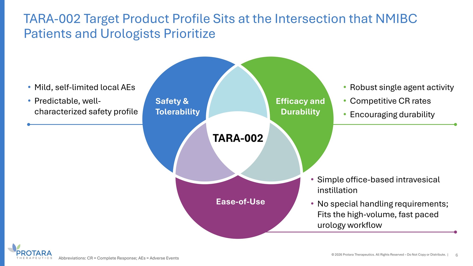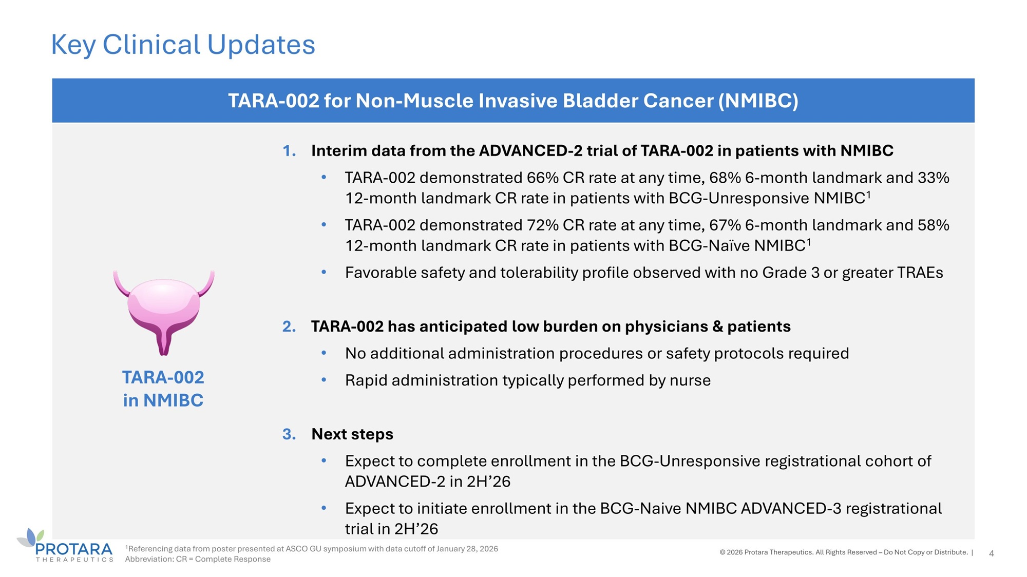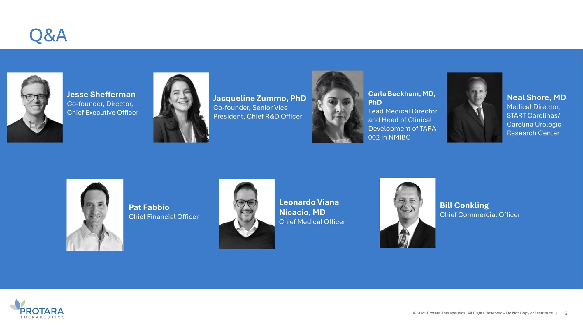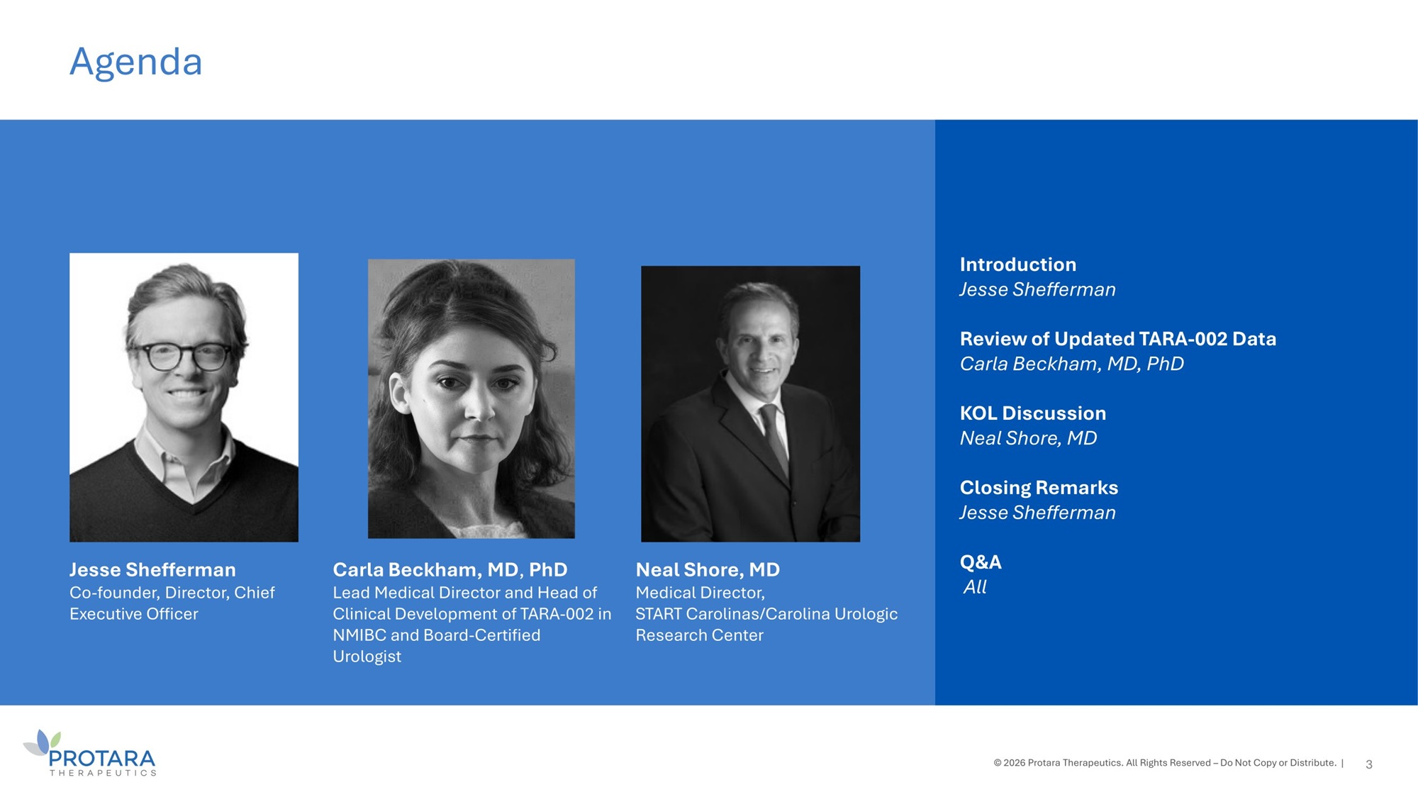 Jesse Shefferman Co - founder, Director, Chief Executive Officer Neal Shore, MD Medical Director, START Carolinas/Carolina Urologic Research Center Introduction Jesse Shefferman Review of Updated TARA - 002 Data Carla Beckham, MD, PhD KOL Discussion Neal Shore, MD Closing Remarks Jesse Shefferman ǪGA All 3 Carla Beckham, MD , PhD Lead Medical Director and Head of Clinical Development of TARA - 002 in NMIBC and Board - Certified Urologist Agenda © 2026 Protara Therapeutics. All Rights Reserved – Do Not Copy or Distribute. |