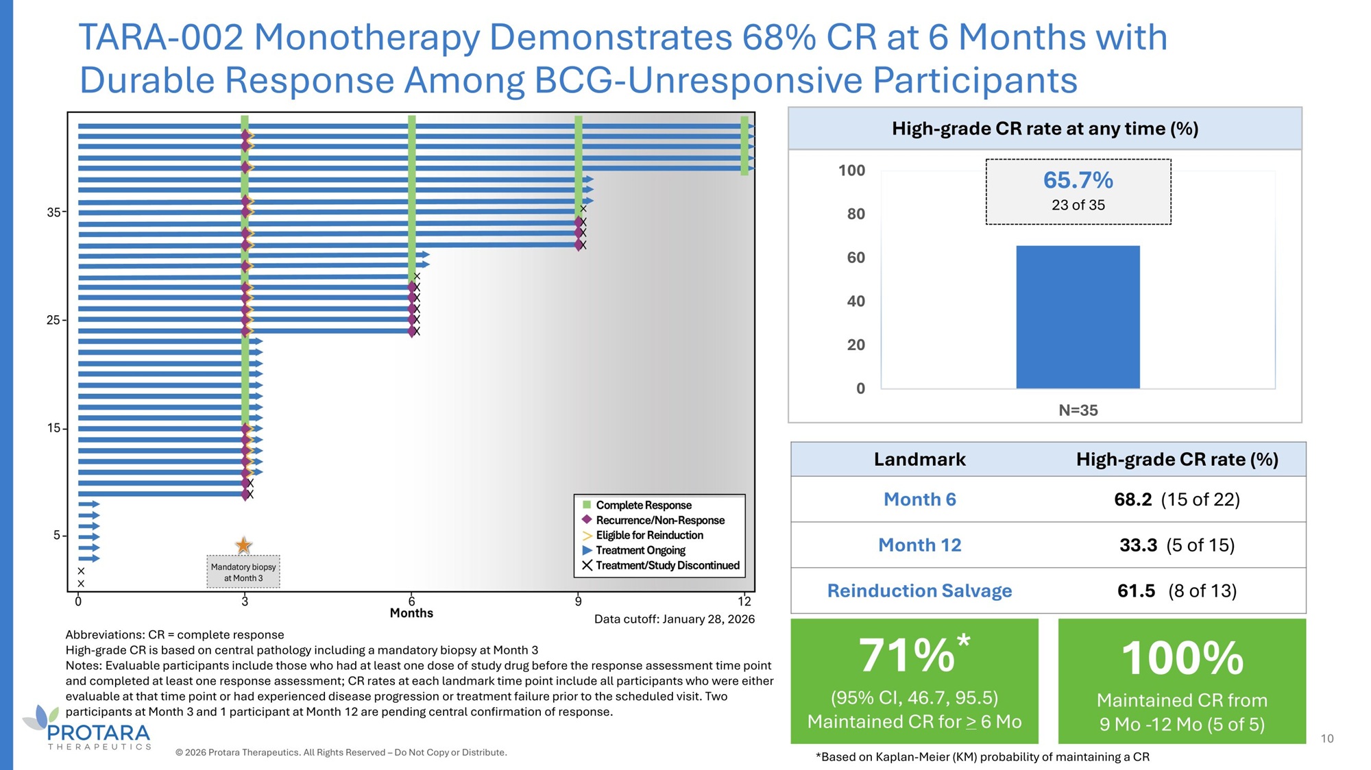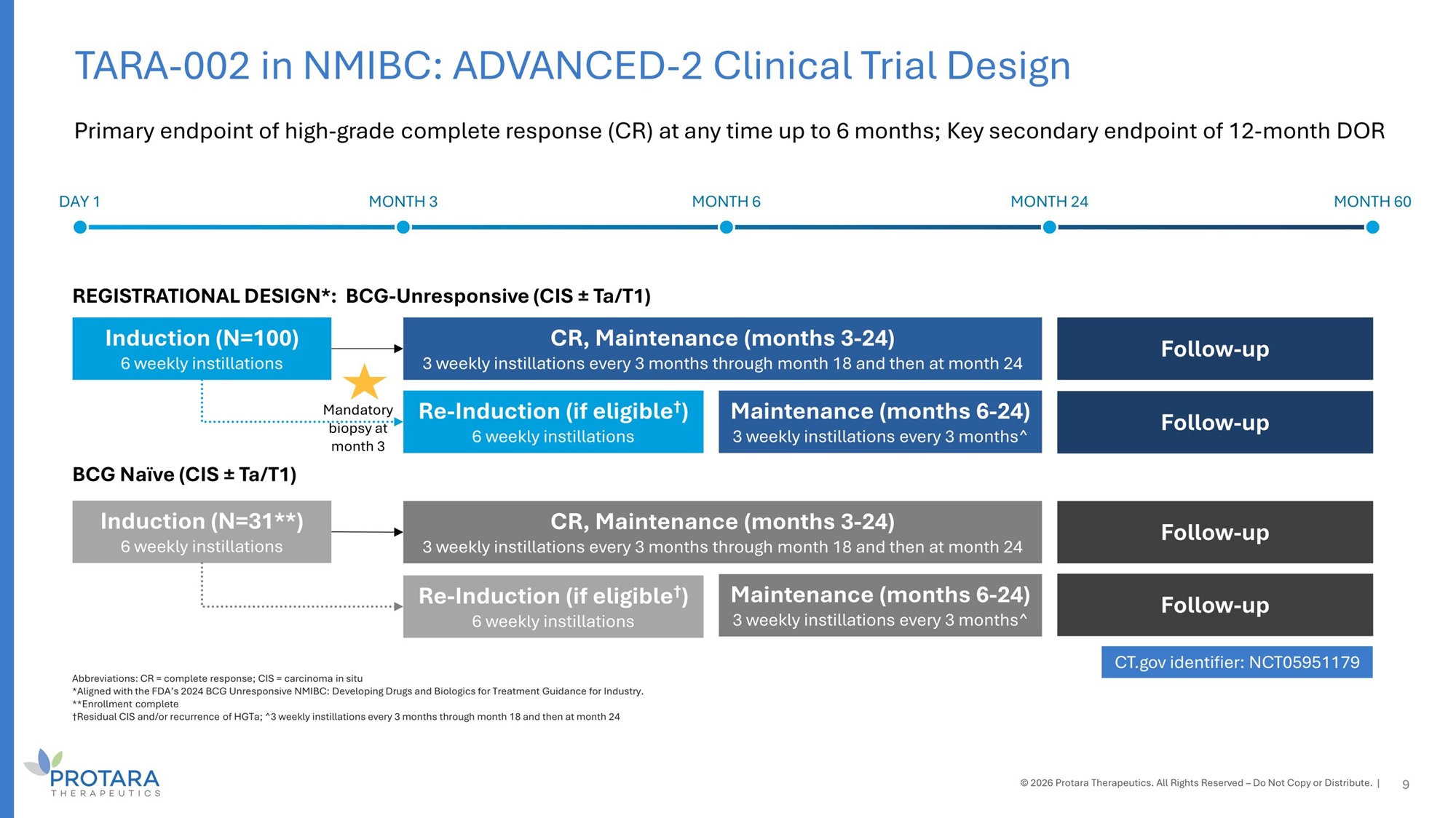 Abbreviations: CR = complete response; CIS = carcinoma in situ *Aligned with the FDA’s 2024 BCG Unresponsive NMIBC: Developing Drugs and Biologics for Treatment Guidance for Industry. **Enrollment complete †Residual CIS and/or recurrence of HGTa; ^3 weekly instillations every 3 months through month 18 and then at month 24 Primary endpoint of high - grade complete response (CR) at any time up to 6 months; Key secondary endpoint of 12 - month DOR 9 DAY 1 MONTH 3 MONTH 6 MONTH 24 MONTH 60 REGISTRATIONAL DESIGN*: BCG - Unresponsive (CIS “ Ta/T1) BCG Naïve (CIS “ Ta/T1) Induction (N=100) 6 weekly instillations Induction (N=31**) 6 weekly instillations CR, Maintenance (months 3 - 24) 3 weekly instillations every 3 months through month 18 and then at month 24 Follow - up Follow - up CR, Maintenance (months 3 - 24) 3 weekly instillations every 3 months through month 18 and then at month 24 Maintenance (months 6 - 24) 3 weekly instillations every 3 months^ Maintenance (months 6 - 24) 3 weekly instillations every 3 months^ Re - Induction (if eligible † ) 6 weekly instillations Re - Induction (if eligible † ) 6 weekly instillations Follow - up Follow - up CT.gov identifier: NCT05951179 © 2026 Protara Therapeutics. All Rights Reserved – Do Not Copy or Distribute. | TARA - 002 in NMIBC: ADVANCED - 2 Clinical Trial Design Mandatory biopsy at month 3