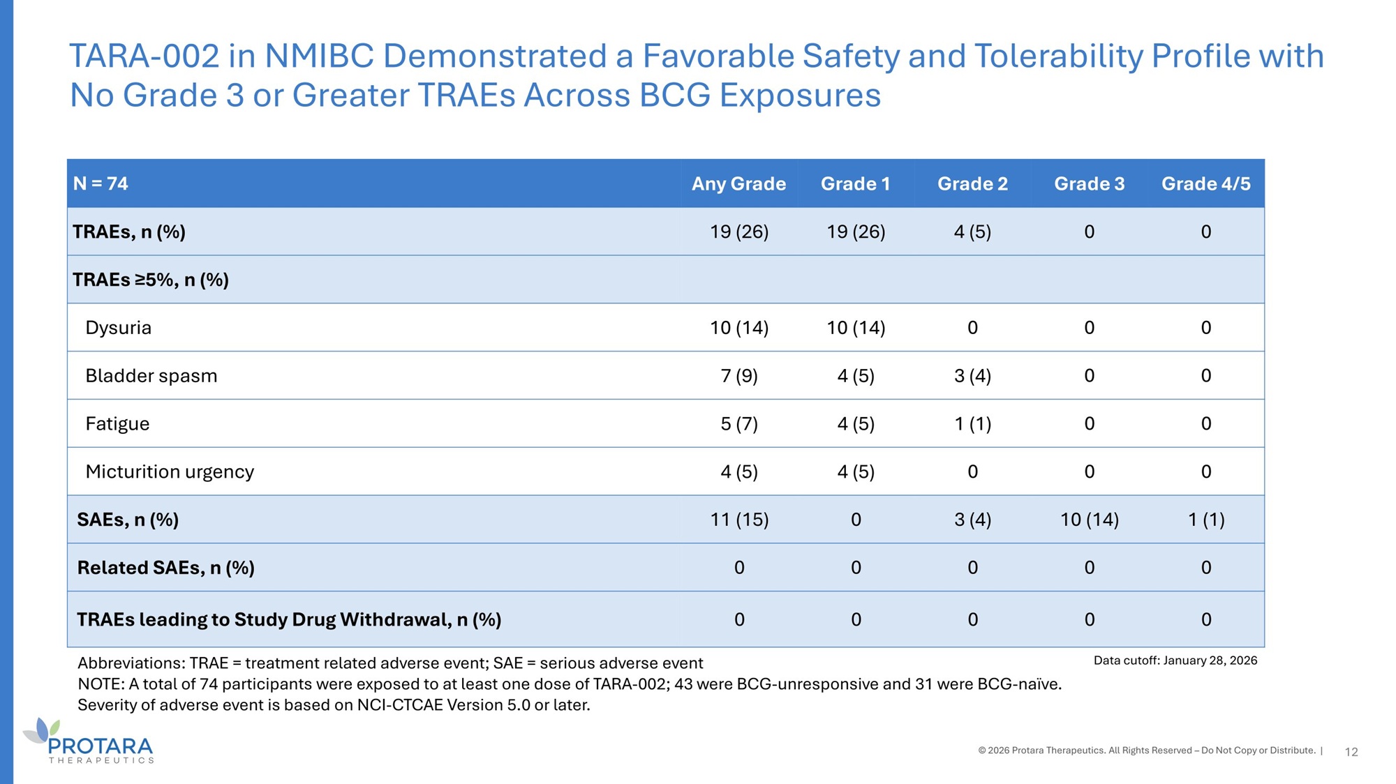 Grade 4/5 Grade 3 Grade 2 Grade 1 Any Grade N = 74 0 0 4 (5) 19 (26) 19 (26) TRAEs, n (%) TRAEs ≥5%, n (%) 0 0 0 10 (14) 10 (14) Dysuria 0 0 3 (4) 4 (5) 7 (9) Bladder spasm 0 0 1 (1) 4 (5) 5 (7) Fatigue 0 0 0 4 (5) 4 (5) Micturition urgency 1 (1) 10 (14) 3 (4) 0 11 (15) SAEs, n (%) 0 0 0 0 0 Related SAEs, n (%) 0 0 0 0 0 TRAEs leading to Study Drug Withdrawal, n (%) Abbreviations: TRAE = treatment related adverse event; SAE = serious adverse event NOTE: A total of 74 participants were exposed to at least one dose of TARA - 002; 43 were BCG - unresponsive and 31 were BCG - naïve. Severity of adverse event is based on NCI - CTCAE Version 5.0 or later. TARA - 002 in NMIBC Demonstrated a Favorable Safety and Tolerability Profile with No Grade 3 or Greater TRAEs Across BCG Exposures © 2026 Protara Therapeutics. All Rights Reserved – Do Not Copy or Distribute. | 12 Data cutoff: January 28, 2026
