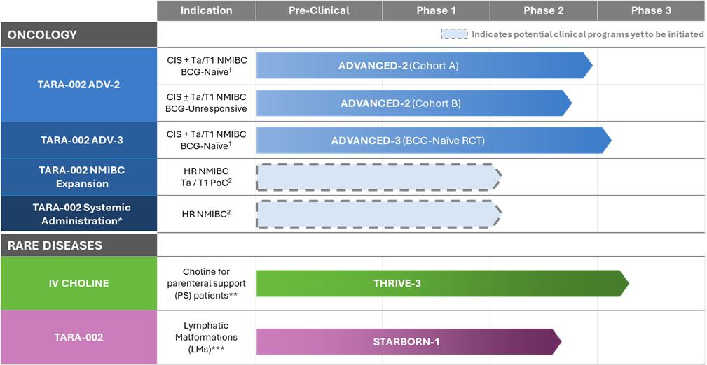 Our portfolio includes two development programs utilizing TARA-002, an investigational cell therapy based on the broad immunopotentiator, OK-432, which was originally granted marketing approval by the Japanese Ministry of Health and Welfare as an immunopotentiating cancer therapeutic agent. This cell therapy is currently approved in Japan and Taiwan for lymphatic malformations, or LMs, and multiple oncologic indications. We have secured worldwide rights to the asset excluding Japan and Taiwan and are exploring its use in oncology and rare disease indications. TARA-002 was developed from the same master cell bank of genetically distinct group A Streptococcus pyogenes as OK-432 (marketed as Picibanil® in Japan by Chugai Pharmaceutical Co., Ltd., or Chugai Pharmaceutical). We are currently developing TARA-002 in non-muscle invasive bladder cancer, or NMIBC, and LMs. We are also pursuing IV Choline Chloride, an investigational phospholipid substrate replacement therapy, for patients receiving parenteral support, or PS, which includes both nutrition and fluids.