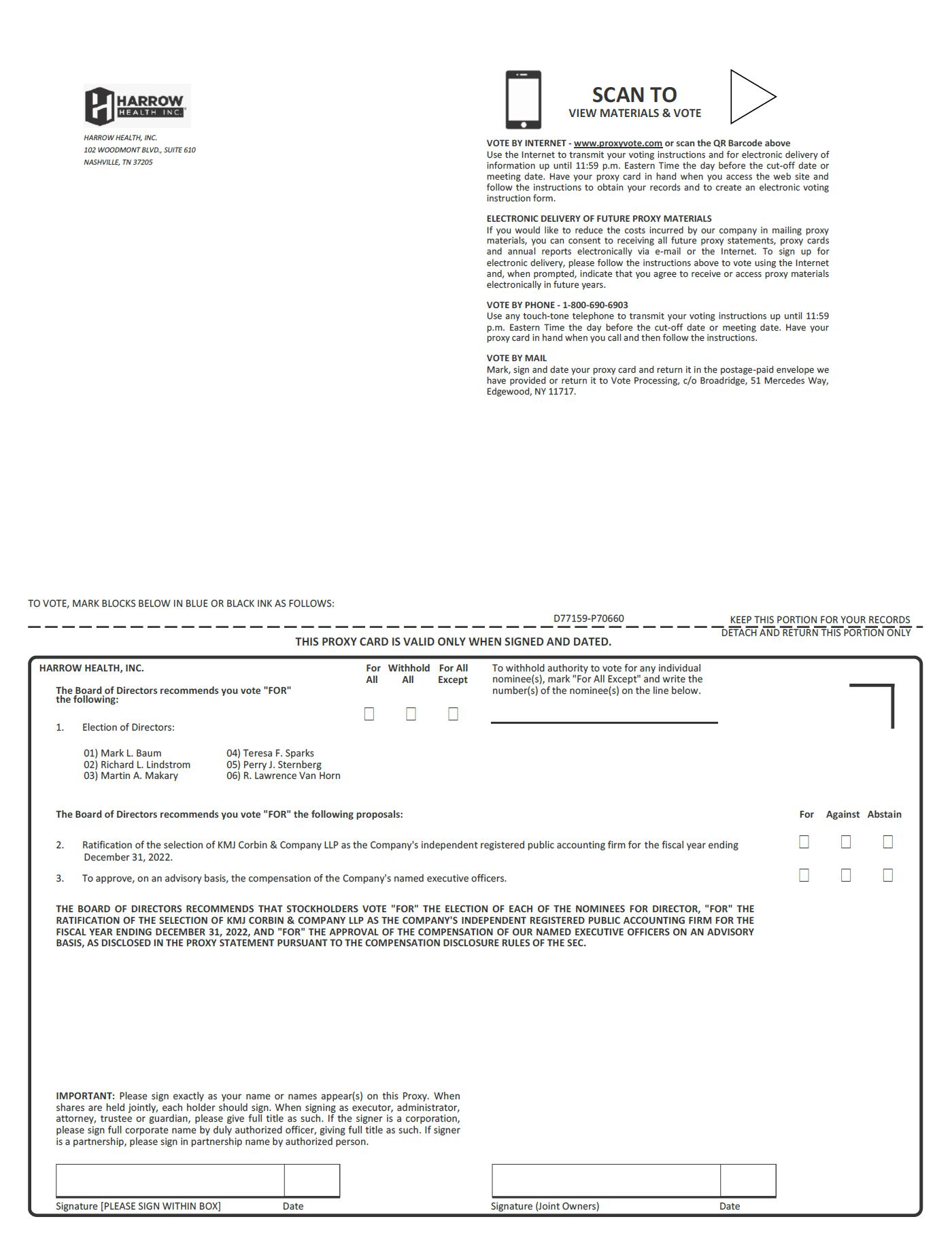 You are cordially invited to attend the 2022 Annual Meeting of Stockholders of Harrow Health, Inc., which will be held at our corporate office located at 102 Woodmont Blvd., Suite 610, Nashville, TN 37205 on June 9, 2022, at 8:00 a.m. (Central Time).