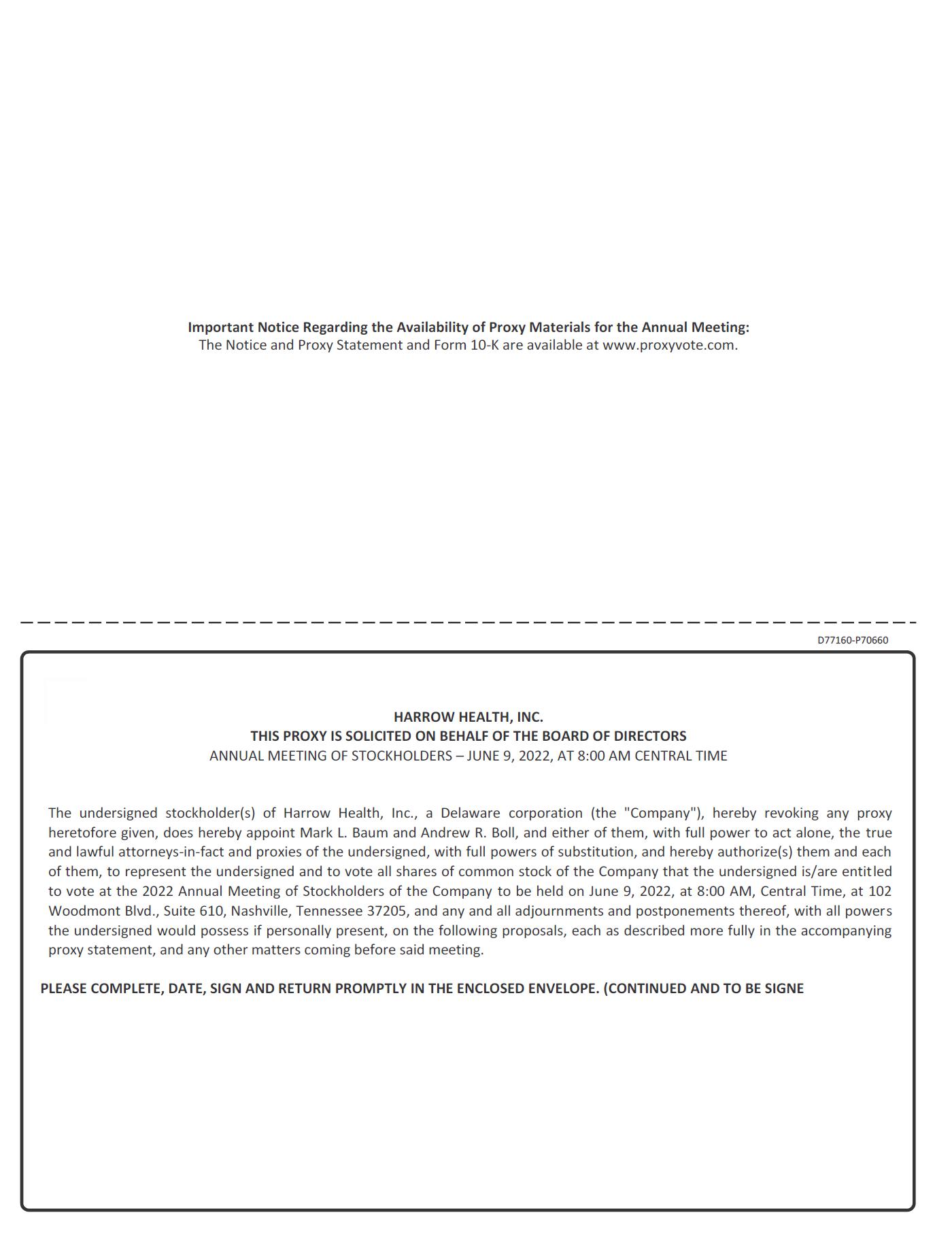 NOTICE IS HEREBY GIVEN that the Annual Meeting of Stockholders of Harrow Health, Inc. (the “Company”) will be held on June 9, 2022, at 8:00 a.m. (Central Time), at the Company’s corporate office located at 102 Woodmont Blvd., Suite 610, Nashville, TN 37205, for the following purposes: