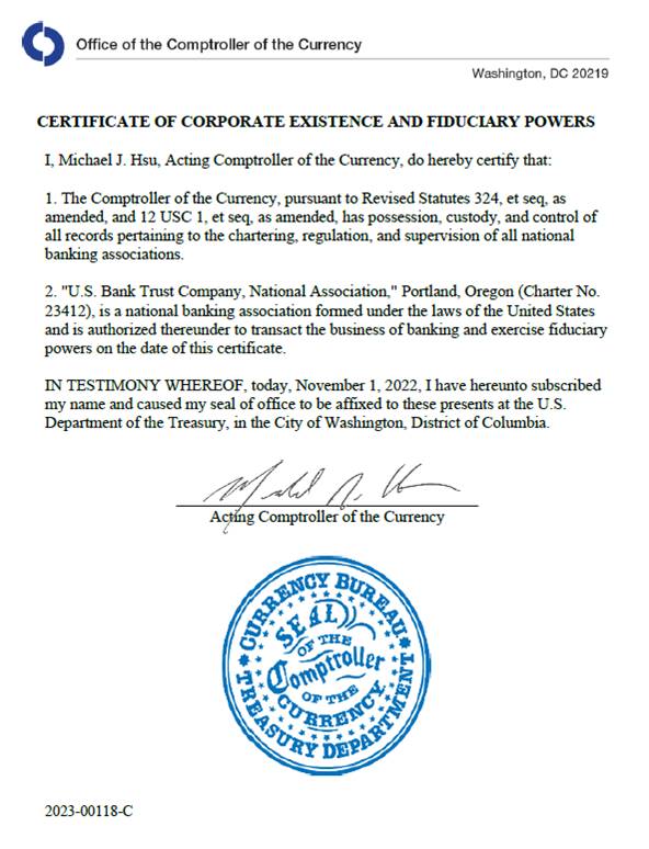 In accordance with Section 321(b) of the Trust Indenture Act of 1939, the undersigned, U.S. BANK TRUST COMPANY, NATIONAL ASSOCIATION hereby consents that reports of examination of the undersigned by Federal, State, Territorial or District authorities may be furnished by such authorities to the Securities and Exchange Commission upon its request therefor.