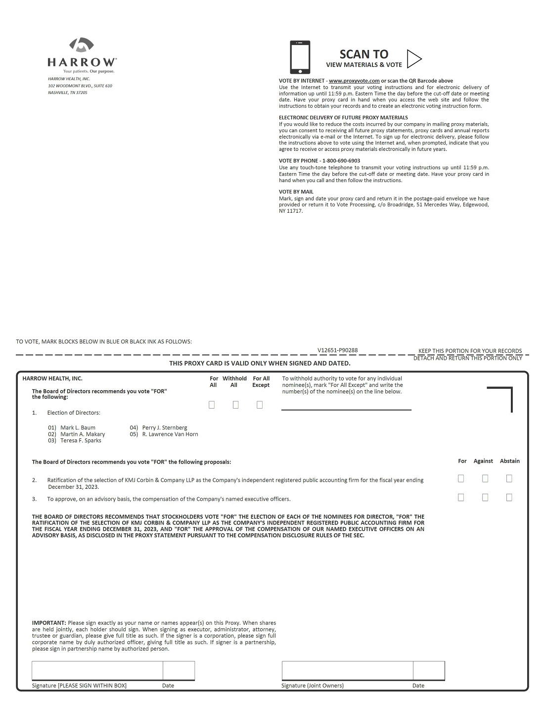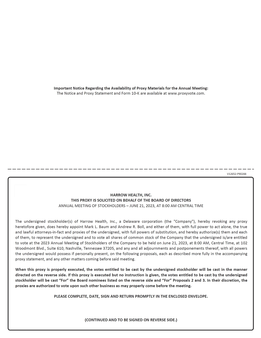 NOTICE IS HEREBY GIVEN that the Annual Meeting of Stockholders of Harrow Health, Inc. (the “Company”) will be held on June 21, 2023, at 8:00 a.m. (Central Time), at the Company’s corporate office located at 102 Woodmont Blvd., Suite 610, Nashville, TN 37205, for the following purposes: