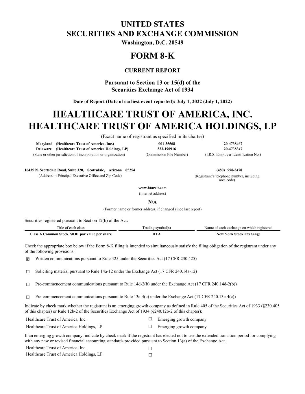 UNITED STATES SECURITIES AND EXCHANGE COMMISSION Washington, D.C. 20549 FORM 8-K CURRENT REPORT Pursuant to Section 13 or 15(d) of the Securities Exchange Act of 1934 Date of Report (Date of earliest event reported): July 1, 2022 (July 1, 2022) HEALTHCARE TRUST OF AMERICA, INC. HEALTHCARE TRUST OF AMERICA HOLDINGS, LP (Exact name of registrant as specified in its charter) Maryland (Healthcare Trust of America, Inc.) 001-35568 20-4738467 Delaware (Healthcare Trust of America Holdings, LP) 333-190916 20-4738347 (State or other jurisdiction of incorporation or organization) (Commission File Number) (I.R.S. Employer Identification No.) 16435 N. Scottsdale Road, Suite 320, Scottsdale, Arizona 85254 (480) 998-3478 (Address of Principal Executive Office and Zip Code) (Registrant’s telephone number, including area code) www.htareit.com (Internet address) N/A (Former name or former address, if changed since last report) Securities registered pursuant to Section 12(b) of the Act: Title of each class Trading symbol(s) Name of each exchange on which registered Class A Common Stock, $0.01 par value per share HTA New York Stock Exchange Check the appropriate box below if the Form 8-K filing is intended to simultaneously satisfy the filing obligation of the registrant under any of the following provisions: ☒ Written communications pursuant to Rule 425 under the Securities Act (17 CFR 230.425) ☐ Soliciting material pursuant to Rule 14a-12 under the Exchange Act (17 CFR 240.14a-12) ☐ Pre-commencement communications pursuant to Rule 14d-2(b) under the Exchange Act (17 CFR 240.14d-2(b)) ☐ Pre-commencement communications pursuant to Rule 13e-4(c) under the Exchange Act (17 CFR 240.13e-4(c)) Indicate by check mark whether the registrant is an emerging growth company as defined in Rule 405 of the Securities Act of 1933 (§230.405 of this chapter) or Rule 12b-2 of the Securities Exchange Act of 1934 (§240.12b-2 of this chapter): Healthcare Trust of America, Inc. ☐ Emerging growth company Healthcare Trust of America Holdings, LP ☐ Emerging growth company If an emerging growth company, indicate by check mark if the registrant has elected not to use the extended transition period for complying with any new or revised financial accounting standards provided pursuant to Section 13(a) of the Exchange Act. Healthcare Trust of America, Inc. ☐ Healthcare Trust of America Holdings, LP ☐