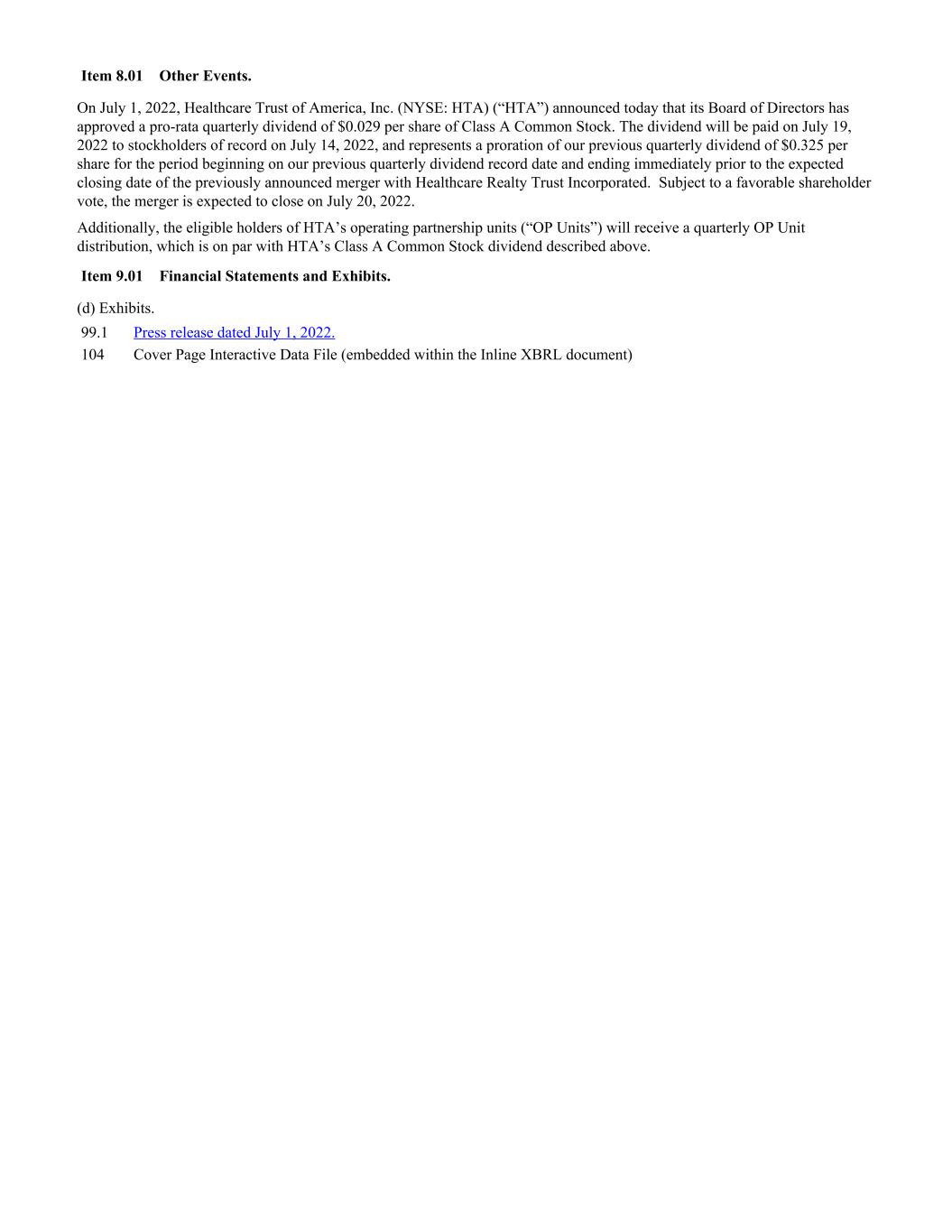Item 8.01 Other Events. On July 1, 2022, Healthcare Trust of America, Inc. (NYSE: HTA) (“HTA”) announced today that its Board of Directors has approved a pro-rata quarterly dividend of $0.029 per share of Class A Common Stock. The dividend will be paid on July 19, 2022 to stockholders of record on July 14, 2022, and represents a proration of our previous quarterly dividend of $0.325 per share for the period beginning on our previous quarterly dividend record date and ending immediately prior to the expected closing date of the previously announced merger with Healthcare Realty Trust Incorporated. Subject to a favorable shareholder vote, the merger is expected to close on July 20, 2022. Additionally, the eligible holders of HTA’s operating partnership units (“OP Units”) will receive a quarterly OP Unit distribution, which is on par with HTA’s Class A Common Stock dividend described above. Item 9.01 Financial Statements and Exhibits. (d) Exhibits. 99.1 Press release dated July 1, 2022. 104 Cover Page Interactive Data File (embedded within the Inline XBRL document)