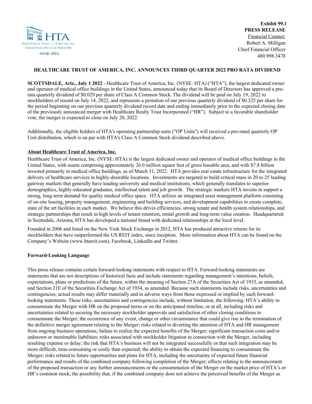 Exhibit 99.1 PRESS RELEASE Financial Contact: Robert A. Milligan Chief Financial Officer 480.998.3478 HEALTHCARE TRUST OF AMERICA, INC. ANNOUNCES THIRD QUARTER 2022 PRO RATA DIVIDEND SCOTTSDALE, Ariz., July 1 2022 - Healthcare Trust of America, Inc. (NYSE: HTA) (“HTA”), the largest dedicated owner and operator of medical office buildings in the United States, announced today that its Board of Directors has approved a pro- rata quarterly dividend of $0.029 per share of Class A Common Stock. The dividend will be paid on July 19, 2022 to stockholders of record on July 14, 2022, and represents a proration of our previous quarterly dividend of $0.325 per share for the period beginning on our previous quarterly dividend record date and ending immediately prior to the expected closing date of the previously announced merger with Healthcare Realty Trust Incorporated (“HR”). Subject to a favorable shareholder vote, the merger is expected to close on July 20, 2022. Additionally, the eligible holders of HTA's operating partnership units ("OP Units") will received a pro-rated quarterly OP Unit distribution, which is on par with HTA's Class A Common Stock dividend described above. About Healthcare Trust of America, Inc. Healthcare Trust of America, Inc. (NYSE: HTA) is the largest dedicated owner and operator of medical office buildings in the United States, with assets comprising approximately 26.0 million square feet of gross leasable area, and with $7.8 billion invested primarily in medical office buildings, as of March 31, 2022. HTA provides real estate infrastructure for the integrated delivery of healthcare services in highly-desirable locations. Investments are targeted to build critical mass in 20 to 25 leading gateway markets that generally have leading university and medical institutions, which generally translates to superior demographics, highly-educated graduates, intellectual talent and job growth. The strategic markets HTA invests in support a strong, long-term demand for quality medical office space. HTA utilizes an integrated asset management platform consisting of on-site leasing, property management, engineering and building services, and development capabilities to create complete, state of the art facilities in each market. We believe this drives efficiencies, strong tenant and health system relationships, and strategic partnerships that result in high levels of tenant retention, rental growth and long-term value creation. Headquartered in Scottsdale, Arizona, HTA has developed a national brand with dedicated relationships at the local level. Founded in 2006 and listed on the New York Stock Exchange in 2012, HTA has produced attractive returns for its stockholders that have outperformed the US REIT index, since inception. More information about HTA can be found on the Company’s Website (www.htareit.com), Facebook, LinkedIn and Twitter. Forward-Looking Language This press release contains certain forward-looking statements with respect to HTA. Forward-looking statements are statements that are not descriptions of historical facts and include statements regarding management’s intentions, beliefs, expectations, plans or predictions of the future, within the meaning of Section 27A of the Securities Act of 1933, as amended, and Section 21E of the Securities Exchange Act of 1934, as amended. Because such statements include risks, uncertainties and contingencies, actual results may differ materially and in adverse ways from those expressed or implied by such forward- looking statements. These risks, uncertainties and contingencies include, without limitation, the following: HTA’s ability to consummate the Merger with HR on the proposed terms or on the anticipated timeline, or at all, including risks and uncertainties related to securing the necessary stockholder approvals and satisfaction of other closing conditions to consummate the Merger; the occurrence of any event, change or other circumstance that could give rise to the termination of the definitive merger agreement relating to the Merger; risks related to diverting the attention of HTA and HR management from ongoing business operations; failure to realize the expected benefits of the Merger; significant transaction costs and/or unknown or inestimable liabilities; risks associated with stockholder litigation in connection with the Merger, including resulting expense or delay; the risk that HTA’s business will not be integrated successfully or that such integration may be more difficult, time-consuming or costly than expected; the ability to obtain the expected financing to consummate the Merger; risks related to future opportunities and plans for HTA, including the uncertainty of expected future financial performance and results of the combined company following completion of the Merger; effects relating to the announcement of the proposed transaction or any further announcements or the consummation of the Merger on the market price of HTA’s or HR’s common stock; the possibility that, if the combined company does not achieve the perceived benefits of the Merger as