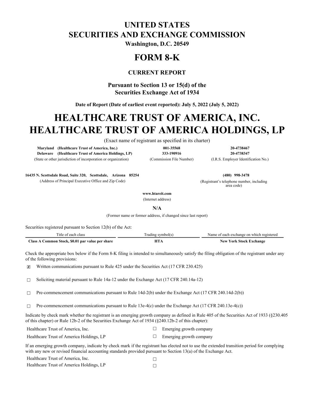 UNITED STATES SECURITIES AND EXCHANGE COMMISSION Washington, D.C. 20549 FORM 8-K CURRENT REPORT Pursuant to Section 13 or 15(d) of the Securities Exchange Act of 1934 Date of Report (Date of earliest event reported): July 5, 2022 (July 5, 2022) HEALTHCARE TRUST OF AMERICA, INC. HEALTHCARE TRUST OF AMERICA HOLDINGS, LP (Exact name of registrant as specified in its charter) Maryland (Healthcare Trust of America, Inc.) 001-35568 20-4738467 Delaware (Healthcare Trust of America Holdings, LP) 333-190916 20-4738347 (State or other jurisdiction of incorporation or organization) (Commission File Number) (I.R.S. Employer Identification No.) 16435 N. Scottsdale Road, Suite 320, Scottsdale, Arizona 85254 (480) 998-3478 (Address of Principal Executive Office and Zip Code) (Registrant’s telephone number, including area code) www.htareit.com (Internet address) N/A (Former name or former address, if changed since last report) Securities registered pursuant to Section 12(b) of the Act: Title of each class Trading symbol(s) Name of each exchange on which registered Class A Common Stock, $0.01 par value per share HTA New York Stock Exchange Check the appropriate box below if the Form 8-K filing is intended to simultaneously satisfy the filing obligation of the registrant under any of the following provisions: ☒ Written communications pursuant to Rule 425 under the Securities Act (17 CFR 230.425) ☐ Soliciting material pursuant to Rule 14a-12 under the Exchange Act (17 CFR 240.14a-12) ☐ Pre-commencement communications pursuant to Rule 14d-2(b) under the Exchange Act (17 CFR 240.14d-2(b)) ☐ Pre-commencement communications pursuant to Rule 13e-4(c) under the Exchange Act (17 CFR 240.13e-4(c)) Indicate by check mark whether the registrant is an emerging growth company as defined in Rule 405 of the Securities Act of 1933 (§230.405 of this chapter) or Rule 12b-2 of the Securities Exchange Act of 1934 (§240.12b-2 of this chapter): Healthcare Trust of America, Inc. ☐ Emerging growth company Healthcare Trust of America Holdings, LP ☐ Emerging growth company If an emerging growth company, indicate by check mark if the registrant has elected not to use the extended transition period for complying with any new or revised financial accounting standards provided pursuant to Section 13(a) of the Exchange Act. Healthcare Trust of America, Inc. ☐ Healthcare Trust of America Holdings, LP ☐