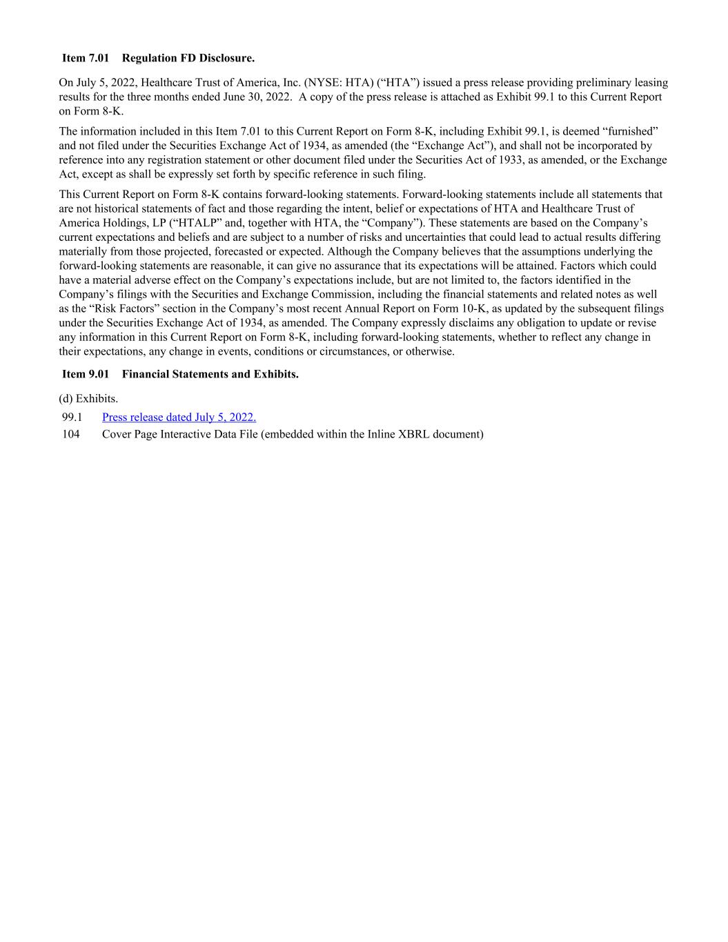 Item 7.01 Regulation FD Disclosure. On July 5, 2022, Healthcare Trust of America, Inc. (NYSE: HTA) (“HTA”) issued a press release providing preliminary leasing results for the three months ended June 30, 2022. A copy of the press release is attached as Exhibit 99.1 to this Current Report on Form 8-K. The information included in this Item 7.01 to this Current Report on Form 8-K, including Exhibit 99.1, is deemed “furnished” and not filed under the Securities Exchange Act of 1934, as amended (the “Exchange Act”), and shall not be incorporated by reference into any registration statement or other document filed under the Securities Act of 1933, as amended, or the Exchange Act, except as shall be expressly set forth by specific reference in such filing. This Current Report on Form 8-K contains forward-looking statements. Forward-looking statements include all statements that are not historical statements of fact and those regarding the intent, belief or expectations of HTA and Healthcare Trust of America Holdings, LP (“HTALP” and, together with HTA, the “Company”). These statements are based on the Company’s current expectations and beliefs and are subject to a number of risks and uncertainties that could lead to actual results differing materially from those projected, forecasted or expected. Although the Company believes that the assumptions underlying the forward-looking statements are reasonable, it can give no assurance that its expectations will be attained. Factors which could have a material adverse effect on the Company’s expectations include, but are not limited to, the factors identified in the Company’s filings with the Securities and Exchange Commission, including the financial statements and related notes as well as the “Risk Factors” section in the Company’s most recent Annual Report on Form 10-K, as updated by the subsequent filings under the Securities Exchange Act of 1934, as amended. The Company expressly disclaims any obligation to update or revise any information in this Current Report on Form 8-K, including forward-looking statements, whether to reflect any change in their expectations, any change in events, conditions or circumstances, or otherwise. Item 9.01 Financial Statements and Exhibits. (d) Exhibits. 99.1 Press release dated July 5, 2022. 104 Cover Page Interactive Data File (embedded within the Inline XBRL document)