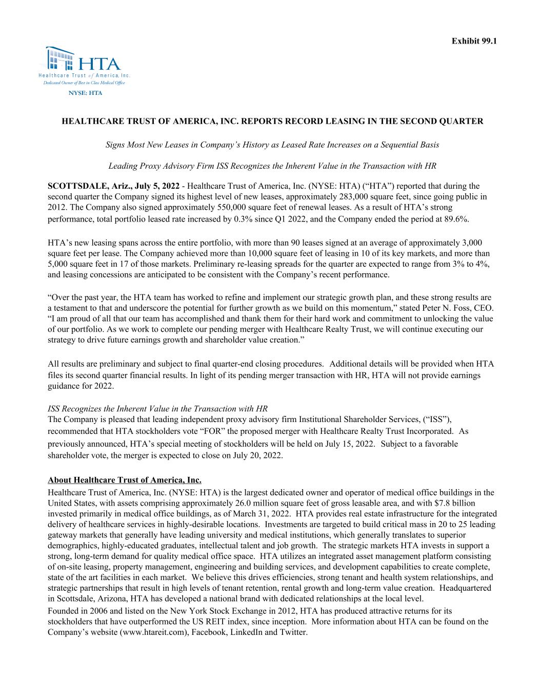 Exhibit 99.1 HEALTHCARE TRUST OF AMERICA, INC. REPORTS RECORD LEASING IN THE SECOND QUARTER Signs Most New Leases in Company’s History as Leased Rate Increases on a Sequential Basis Leading Proxy Advisory Firm ISS Recognizes the Inherent Value in the Transaction with HR SCOTTSDALE, Ariz., July 5, 2022 - Healthcare Trust of America, Inc. (NYSE: HTA) (“HTA”) reported that during the second quarter the Company signed its highest level of new leases, approximately 283,000 square feet, since going public in 2012. The Company also signed approximately 550,000 square feet of renewal leases. As a result of HTA’s strong performance, total portfolio leased rate increased by 0.3% since Q1 2022, and the Company ended the period at 89.6%. HTA’s new leasing spans across the entire portfolio, with more than 90 leases signed at an average of approximately 3,000 square feet per lease. The Company achieved more than 10,000 square feet of leasing in 10 of its key markets, and more than 5,000 square feet in 17 of those markets. Preliminary re-leasing spreads for the quarter are expected to range from 3% to 4%, and leasing concessions are anticipated to be consistent with the Company’s recent performance. “Over the past year, the HTA team has worked to refine and implement our strategic growth plan, and these strong results are a testament to that and underscore the potential for further growth as we build on this momentum,” stated Peter N. Foss, CEO. “I am proud of all that our team has accomplished and thank them for their hard work and commitment to unlocking the value of our portfolio. As we work to complete our pending merger with Healthcare Realty Trust, we will continue executing our strategy to drive future earnings growth and shareholder value creation.” All results are preliminary and subject to final quarter-end closing procedures. Additional details will be provided when HTA files its second quarter financial results. In light of its pending merger transaction with HR, HTA will not provide earnings guidance for 2022. ISS Recognizes the Inherent Value in the Transaction with HR The Company is pleased that leading independent proxy advisory firm Institutional Shareholder Services, (“ISS”), recommended that HTA stockholders vote “FOR” the proposed merger with Healthcare Realty Trust Incorporated. As previously announced, HTA’s special meeting of stockholders will be held on July 15, 2022. Subject to a favorable shareholder vote, the merger is expected to close on July 20, 2022. About Healthcare Trust of America, Inc. Healthcare Trust of America, Inc. (NYSE: HTA) is the largest dedicated owner and operator of medical office buildings in the United States, with assets comprising approximately 26.0 million square feet of gross leasable area, and with $7.8 billion invested primarily in medical office buildings, as of March 31, 2022. HTA provides real estate infrastructure for the integrated delivery of healthcare services in highly-desirable locations. Investments are targeted to build critical mass in 20 to 25 leading gateway markets that generally have leading university and medical institutions, which generally translates to superior demographics, highly-educated graduates, intellectual talent and job growth. The strategic markets HTA invests in support a strong, long-term demand for quality medical office space. HTA utilizes an integrated asset management platform consisting of on-site leasing, property management, engineering and building services, and development capabilities to create complete, state of the art facilities in each market. We believe this drives efficiencies, strong tenant and health system relationships, and strategic partnerships that result in high levels of tenant retention, rental growth and long-term value creation. Headquartered in Scottsdale, Arizona, HTA has developed a national brand with dedicated relationships at the local level. Founded in 2006 and listed on the New York Stock Exchange in 2012, HTA has produced attractive returns for its stockholders that have outperformed the US REIT index, since inception. More information about HTA can be found on the Company’s website (www.htareit.com), Facebook, LinkedIn and Twitter.