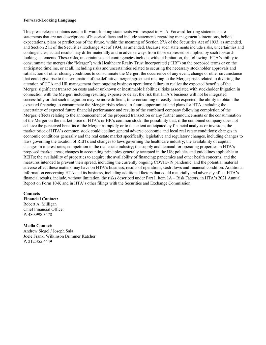 Forward-Looking Language This press release contains certain forward-looking statements with respect to HTA. Forward-looking statements are statements that are not descriptions of historical facts and include statements regarding management’s intentions, beliefs, expectations, plans or predictions of the future, within the meaning of Section 27A of the Securities Act of 1933, as amended, and Section 21E of the Securities Exchange Act of 1934, as amended. Because such statements include risks, uncertainties and contingencies, actual results may differ materially and in adverse ways from those expressed or implied by such forward- looking statements. These risks, uncertainties and contingencies include, without limitation, the following: HTA’s ability to consummate the merger (the “Merger”) with Healthcare Realty Trust Incorporated (“HR”) on the proposed terms or on the anticipated timeline, or at all, including risks and uncertainties related to securing the necessary stockholder approvals and satisfaction of other closing conditions to consummate the Merger; the occurrence of any event, change or other circumstance that could give rise to the termination of the definitive merger agreement relating to the Merger; risks related to diverting the attention of HTA and HR management from ongoing business operations; failure to realize the expected benefits of the Merger; significant transaction costs and/or unknown or inestimable liabilities; risks associated with stockholder litigation in connection with the Merger, including resulting expense or delay; the risk that HTA’s business will not be integrated successfully or that such integration may be more difficult, time-consuming or costly than expected; the ability to obtain the expected financing to consummate the Merger; risks related to future opportunities and plans for HTA, including the uncertainty of expected future financial performance and results of the combined company following completion of the Merger; effects relating to the announcement of the proposed transaction or any further announcements or the consummation of the Merger on the market price of HTA’s or HR’s common stock; the possibility that, if the combined company does not achieve the perceived benefits of the Merger as rapidly or to the extent anticipated by financial analysts or investors, the market price of HTA’s common stock could decline; general adverse economic and local real estate conditions; changes in economic conditions generally and the real estate market specifically; legislative and regulatory changes, including changes to laws governing the taxation of REITs and changes to laws governing the healthcare industry; the availability of capital; changes in interest rates; competition in the real estate industry; the supply and demand for operating properties in HTA’s proposed market areas; changes in accounting principles generally accepted in the US; policies and guidelines applicable to REITs; the availability of properties to acquire; the availability of financing; pandemics and other health concerns, and the measures intended to prevent their spread, including the currently ongoing COVID-19 pandemic; and the potential material adverse effect these matters may have on HTA’s business, results of operations, cash flows and financial condition. Additional information concerning HTA and its business, including additional factors that could materially and adversely affect HTA’s financial results, include, without limitation, the risks described under Part I, Item 1A – Risk Factors, in HTA’s 2021 Annual Report on Form 10-K and in HTA’s other filings with the Securities and Exchange Commission. Contacts Financial Contact: Robert A. Milligan Chief Financial Officer P: 480.998.3478 Media Contact: Andrew Siegel / Joseph Sala Joele Frank, Wilkinson Brimmer Katcher P: 212.355.4449
