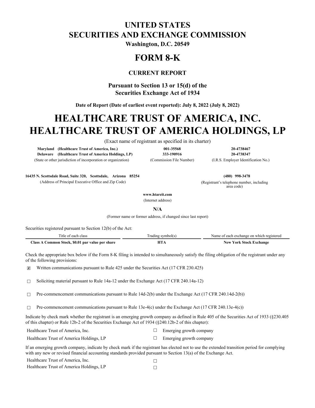 UNITED STATES SECURITIES AND EXCHANGE COMMISSION Washington, D.C. 20549 FORM 8-K CURRENT REPORT Pursuant to Section 13 or 15(d) of the Securities Exchange Act of 1934 Date of Report (Date of earliest event reported): July 8, 2022 (July 8, 2022) HEALTHCARE TRUST OF AMERICA, INC. HEALTHCARE TRUST OF AMERICA HOLDINGS, LP (Exact name of registrant as specified in its charter) Maryland (Healthcare Trust of America, Inc.) 001-35568 20-4738467 Delaware (Healthcare Trust of America Holdings, LP) 333-190916 20-4738347 (State or other jurisdiction of incorporation or organization) (Commission File Number) (I.R.S. Employer Identification No.) 16435 N. Scottsdale Road, Suite 320, Scottsdale, Arizona 85254 (480) 998-3478 (Address of Principal Executive Office and Zip Code) (Registrant’s telephone number, including area code) www.htareit.com (Internet address) N/A (Former name or former address, if changed since last report) Securities registered pursuant to Section 12(b) of the Act: Title of each class Trading symbol(s) Name of each exchange on which registered Class A Common Stock, $0.01 par value per share HTA New York Stock Exchange Check the appropriate box below if the Form 8-K filing is intended to simultaneously satisfy the filing obligation of the registrant under any of the following provisions: ☒ Written communications pursuant to Rule 425 under the Securities Act (17 CFR 230.425) ☐ Soliciting material pursuant to Rule 14a-12 under the Exchange Act (17 CFR 240.14a-12) ☐ Pre-commencement communications pursuant to Rule 14d-2(b) under the Exchange Act (17 CFR 240.14d-2(b)) ☐ Pre-commencement communications pursuant to Rule 13e-4(c) under the Exchange Act (17 CFR 240.13e-4(c)) Indicate by check mark whether the registrant is an emerging growth company as defined in Rule 405 of the Securities Act of 1933 (§230.405 of this chapter) or Rule 12b-2 of the Securities Exchange Act of 1934 (§240.12b-2 of this chapter): Healthcare Trust of America, Inc. ☐ Emerging growth company Healthcare Trust of America Holdings, LP ☐ Emerging growth company If an emerging growth company, indicate by check mark if the registrant has elected not to use the extended transition period for complying with any new or revised financial accounting standards provided pursuant to Section 13(a) of the Exchange Act. Healthcare Trust of America, Inc. ☐ Healthcare Trust of America Holdings, LP ☐