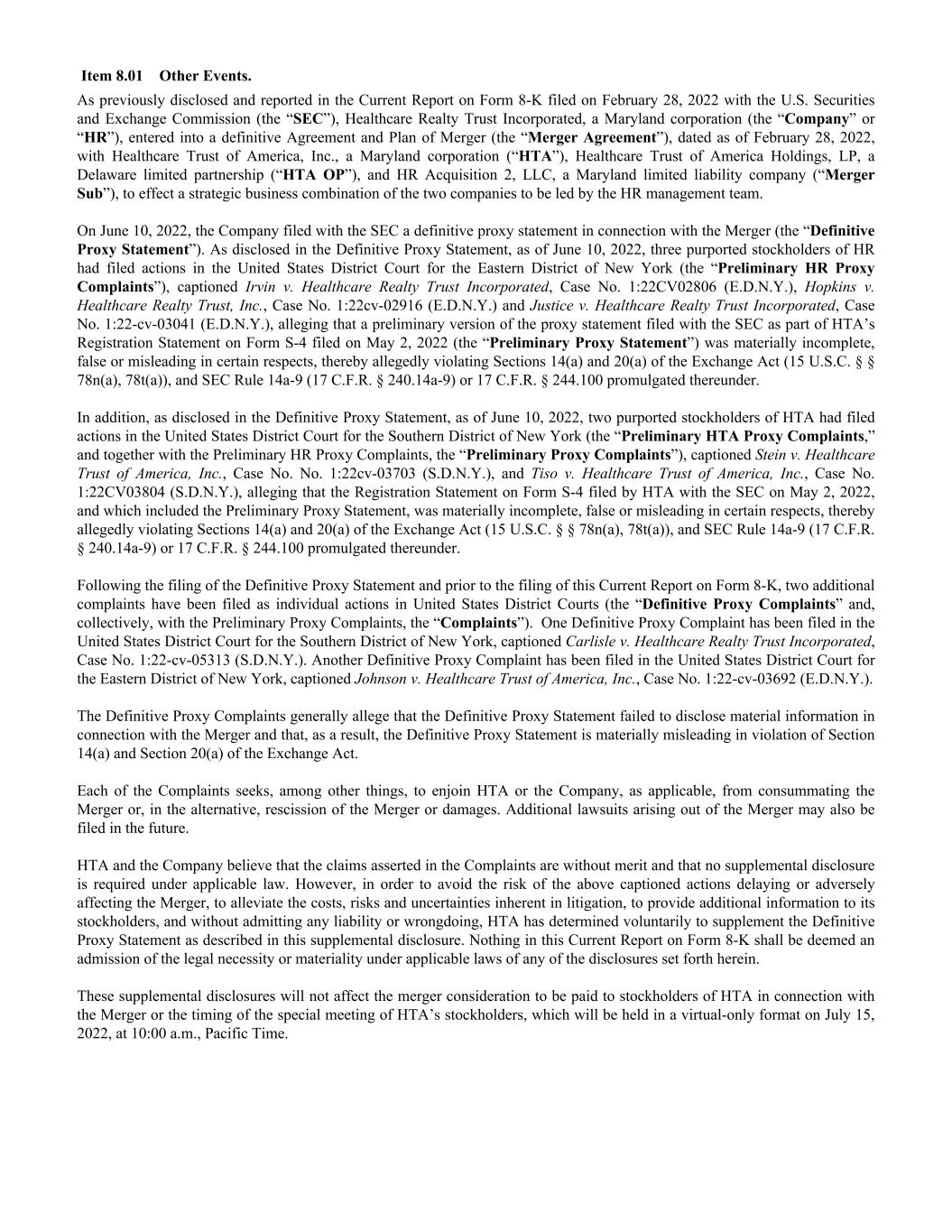 Item 8.01 Other Events. As previously disclosed and reported in the Current Report on Form 8-K filed on February 28, 2022 with the U.S. Securities and Exchange Commission (the “SEC”), Healthcare Realty Trust Incorporated, a Maryland corporation (the “Company” or “HR”), entered into a definitive Agreement and Plan of Merger (the “Merger Agreement”), dated as of February 28, 2022, with Healthcare Trust of America, Inc., a Maryland corporation (“HTA”), Healthcare Trust of America Holdings, LP, a Delaware limited partnership (“HTA OP”), and HR Acquisition 2, LLC, a Maryland limited liability company (“Merger Sub”), to effect a strategic business combination of the two companies to be led by the HR management team. On June 10, 2022, the Company filed with the SEC a definitive proxy statement in connection with the Merger (the “Definitive Proxy Statement”). As disclosed in the Definitive Proxy Statement, as of June 10, 2022, three purported stockholders of HR had filed actions in the United States District Court for the Eastern District of New York (the “Preliminary HR Proxy Complaints”), captioned Irvin v. Healthcare Realty Trust Incorporated, Case No. 1:22CV02806 (E.D.N.Y.), Hopkins v. Healthcare Realty Trust, Inc., Case No. 1:22cv-02916 (E.D.N.Y.) and Justice v. Healthcare Realty Trust Incorporated, Case No. 1:22-cv-03041 (E.D.N.Y.), alleging that a preliminary version of the proxy statement filed with the SEC as part of HTA’s Registration Statement on Form S-4 filed on May 2, 2022 (the “Preliminary Proxy Statement”) was materially incomplete, false or misleading in certain respects, thereby allegedly violating Sections 14(a) and 20(a) of the Exchange Act (15 U.S.C. § § 78n(a), 78t(a)), and SEC Rule 14a-9 (17 C.F.R. § 240.14a-9) or 17 C.F.R. § 244.100 promulgated thereunder. In addition, as disclosed in the Definitive Proxy Statement, as of June 10, 2022, two purported stockholders of HTA had filed actions in the United States District Court for the Southern District of New York (the “Preliminary HTA Proxy Complaints,” and together with the Preliminary HR Proxy Complaints, the “Preliminary Proxy Complaints”), captioned Stein v. Healthcare Trust of America, Inc., Case No. No. 1:22cv-03703 (S.D.N.Y.), and Tiso v. Healthcare Trust of America, Inc., Case No. 1:22CV03804 (S.D.N.Y.), alleging that the Registration Statement on Form S-4 filed by HTA with the SEC on May 2, 2022, and which included the Preliminary Proxy Statement, was materially incomplete, false or misleading in certain respects, thereby allegedly violating Sections 14(a) and 20(a) of the Exchange Act (15 U.S.C. § § 78n(a), 78t(a)), and SEC Rule 14a-9 (17 C.F.R. § 240.14a-9) or 17 C.F.R. § 244.100 promulgated thereunder. Following the filing of the Definitive Proxy Statement and prior to the filing of this Current Report on Form 8-K, two additional complaints have been filed as individual actions in United States District Courts (the “Definitive Proxy Complaints” and, collectively, with the Preliminary Proxy Complaints, the “Complaints”). One Definitive Proxy Complaint has been filed in the United States District Court for the Southern District of New York, captioned Carlisle v. Healthcare Realty Trust Incorporated, Case No. 1:22-cv-05313 (S.D.N.Y.). Another Definitive Proxy Complaint has been filed in the United States District Court for the Eastern District of New York, captioned Johnson v. Healthcare Trust of America, Inc., Case No. 1:22-cv-03692 (E.D.N.Y.). The Definitive Proxy Complaints generally allege that the Definitive Proxy Statement failed to disclose material information in connection with the Merger and that, as a result, the Definitive Proxy Statement is materially misleading in violation of Section 14(a) and Section 20(a) of the Exchange Act. Each of the Complaints seeks, among other things, to enjoin HTA or the Company, as applicable, from consummating the Merger or, in the alternative, rescission of the Merger or damages. Additional lawsuits arising out of the Merger may also be filed in the future. HTA and the Company believe that the claims asserted in the Complaints are without merit and that no supplemental disclosure is required under applicable law. However, in order to avoid the risk of the above captioned actions delaying or adversely affecting the Merger, to alleviate the costs, risks and uncertainties inherent in litigation, to provide additional information to its stockholders, and without admitting any liability or wrongdoing, HTA has determined voluntarily to supplement the Definitive Proxy Statement as described in this supplemental disclosure. Nothing in this Current Report on Form 8-K shall be deemed an admission of the legal necessity or materiality under applicable laws of any of the disclosures set forth herein. These supplemental disclosures will not affect the merger consideration to be paid to stockholders of HTA in connection with the Merger or the timing of the special meeting of HTA’s stockholders, which will be held in a virtual-only format on July 15, 2022, at 10:00 a.m., Pacific Time.