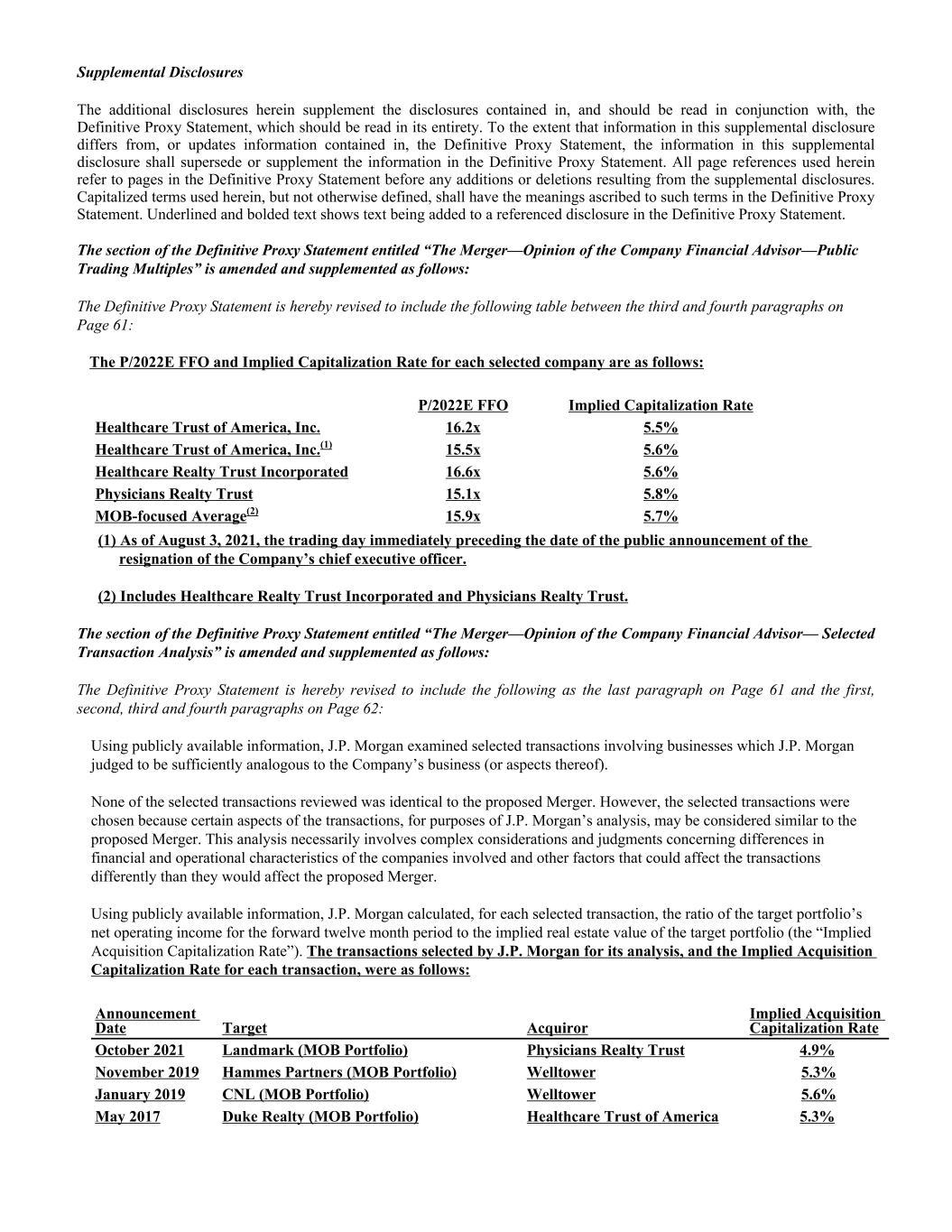 Supplemental Disclosures The additional disclosures herein supplement the disclosures contained in, and should be read in conjunction with, the Definitive Proxy Statement, which should be read in its entirety. To the extent that information in this supplemental disclosure differs from, or updates information contained in, the Definitive Proxy Statement, the information in this supplemental disclosure shall supersede or supplement the information in the Definitive Proxy Statement. All page references used herein refer to pages in the Definitive Proxy Statement before any additions or deletions resulting from the supplemental disclosures. Capitalized terms used herein, but not otherwise defined, shall have the meanings ascribed to such terms in the Definitive Proxy Statement. Underlined and bolded text shows text being added to a referenced disclosure in the Definitive Proxy Statement. The section of the Definitive Proxy Statement entitled “The Merger—Opinion of the Company Financial Advisor—Public Trading Multiples” is amended and supplemented as follows: The Definitive Proxy Statement is hereby revised to include the following table between the third and fourth paragraphs on Page 61: The P/2022E FFO and Implied Capitalization Rate for each selected company are as follows: P/2022E FFO Implied Capitalization Rate Healthcare Trust of America, Inc. 16.2x 5.5% Healthcare Trust of America, Inc.(1) 15.5x 5.6% Healthcare Realty Trust Incorporated 16.6x 5.6% Physicians Realty Trust 15.1x 5.8% MOB-focused Average(2) 15.9x 5.7% (1) As of August 3, 2021, the trading day immediately preceding the date of the public announcement of the resignation of the Company’s chief executive officer. (2) Includes Healthcare Realty Trust Incorporated and Physicians Realty Trust. The section of the Definitive Proxy Statement entitled “The Merger—Opinion of the Company Financial Advisor— Selected Transaction Analysis” is amended and supplemented as follows: The Definitive Proxy Statement is hereby revised to include the following as the last paragraph on Page 61 and the first, second, third and fourth paragraphs on Page 62: Using publicly available information, J.P. Morgan examined selected transactions involving businesses which J.P. Morgan judged to be sufficiently analogous to the Company’s business (or aspects thereof). None of the selected transactions reviewed was identical to the proposed Merger. However, the selected transactions were chosen because certain aspects of the transactions, for purposes of J.P. Morgan’s analysis, may be considered similar to the proposed Merger. This analysis necessarily involves complex considerations and judgments concerning differences in financial and operational characteristics of the companies involved and other factors that could affect the transactions differently than they would affect the proposed Merger. Using publicly available information, J.P. Morgan calculated, for each selected transaction, the ratio of the target portfolio’s net operating income for the forward twelve month period to the implied real estate value of the target portfolio (the “Implied Acquisition Capitalization Rate”). The transactions selected by J.P. Morgan for its analysis, and the Implied Acquisition Capitalization Rate for each transaction, were as follows: Announcement Date Target Acquiror Implied Acquisition Capitalization Rate October 2021 Landmark (MOB Portfolio) Physicians Realty Trust 4.9% November 2019 Hammes Partners (MOB Portfolio) Welltower 5.3% January 2019 CNL (MOB Portfolio) Welltower 5.6% May 2017 Duke Realty (MOB Portfolio) Healthcare Trust of America 5.3%
