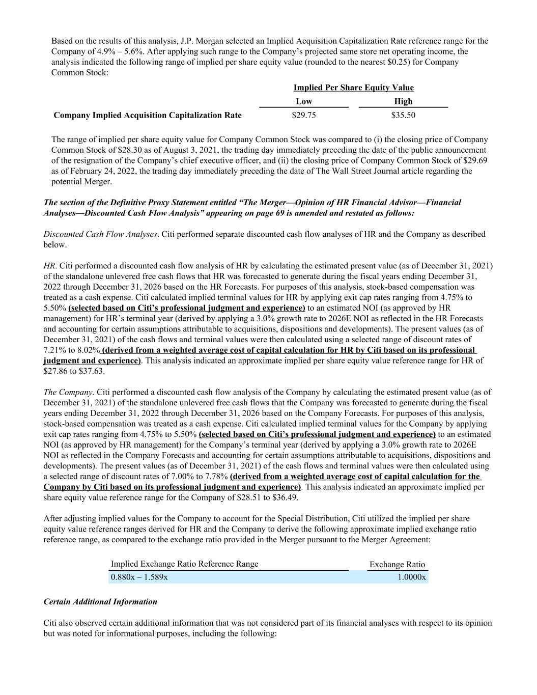 Based on the results of this analysis, J.P. Morgan selected an Implied Acquisition Capitalization Rate reference range for the Company of 4.9% – 5.6%. After applying such range to the Company’s projected same store net operating income, the analysis indicated the following range of implied per share equity value (rounded to the nearest $0.25) for Company Common Stock: Implied Per Share Equity Value Low High Company Implied Acquisition Capitalization Rate $29.75 $35.50 The range of implied per share equity value for Company Common Stock was compared to (i) the closing price of Company Common Stock of $28.30 as of August 3, 2021, the trading day immediately preceding the date of the public announcement of the resignation of the Company’s chief executive officer, and (ii) the closing price of Company Common Stock of $29.69 as of February 24, 2022, the trading day immediately preceding the date of The Wall Street Journal article regarding the potential Merger. The section of the Definitive Proxy Statement entitled “The Merger—Opinion of HR Financial Advisor—Financial Analyses—Discounted Cash Flow Analysis” appearing on page 69 is amended and restated as follows: Discounted Cash Flow Analyses. Citi performed separate discounted cash flow analyses of HR and the Company as described below. HR. Citi performed a discounted cash flow analysis of HR by calculating the estimated present value (as of December 31, 2021) of the standalone unlevered free cash flows that HR was forecasted to generate during the fiscal years ending December 31, 2022 through December 31, 2026 based on the HR Forecasts. For purposes of this analysis, stock-based compensation was treated as a cash expense. Citi calculated implied terminal values for HR by applying exit cap rates ranging from 4.75% to 5.50% (selected based on Citi’s professional judgment and experience) to an estimated NOI (as approved by HR management) for HR’s terminal year (derived by applying a 3.0% growth rate to 2026E NOI as reflected in the HR Forecasts and accounting for certain assumptions attributable to acquisitions, dispositions and developments). The present values (as of December 31, 2021) of the cash flows and terminal values were then calculated using a selected range of discount rates of 7.21% to 8.02% (derived from a weighted average cost of capital calculation for HR by Citi based on its professional judgment and experience). This analysis indicated an approximate implied per share equity value reference range for HR of $27.86 to $37.63. The Company. Citi performed a discounted cash flow analysis of the Company by calculating the estimated present value (as of December 31, 2021) of the standalone unlevered free cash flows that the Company was forecasted to generate during the fiscal years ending December 31, 2022 through December 31, 2026 based on the Company Forecasts. For purposes of this analysis, stock-based compensation was treated as a cash expense. Citi calculated implied terminal values for the Company by applying exit cap rates ranging from 4.75% to 5.50% (selected based on Citi’s professional judgment and experience) to an estimated NOI (as approved by HR management) for the Company’s terminal year (derived by applying a 3.0% growth rate to 2026E NOI as reflected in the Company Forecasts and accounting for certain assumptions attributable to acquisitions, dispositions and developments). The present values (as of December 31, 2021) of the cash flows and terminal values were then calculated using a selected range of discount rates of 7.00% to 7.78% (derived from a weighted average cost of capital calculation for the Company by Citi based on its professional judgment and experience). This analysis indicated an approximate implied per share equity value reference range for the Company of $28.51 to $36.49. After adjusting implied values for the Company to account for the Special Distribution, Citi utilized the implied per share equity value reference ranges derived for HR and the Company to derive the following approximate implied exchange ratio reference range, as compared to the exchange ratio provided in the Merger pursuant to the Merger Agreement: Implied Exchange Ratio Reference Range Exchange Ratio 0.880x – 1.589x 1.0000x Certain Additional Information Citi also observed certain additional information that was not considered part of its financial analyses with respect to its opinion but was noted for informational purposes, including the following: