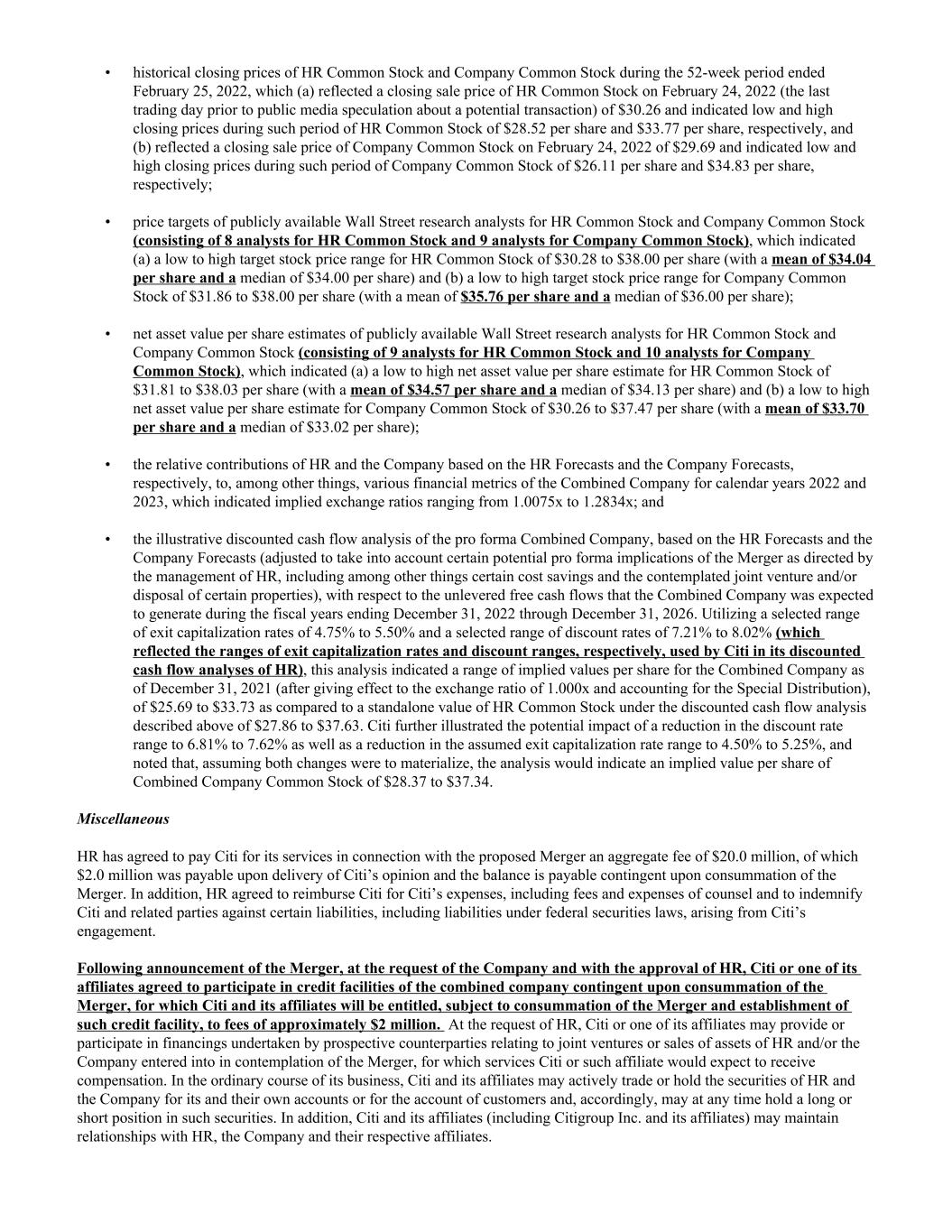 • historical closing prices of HR Common Stock and Company Common Stock during the 52-week period ended February 25, 2022, which (a) reflected a closing sale price of HR Common Stock on February 24, 2022 (the last trading day prior to public media speculation about a potential transaction) of $30.26 and indicated low and high closing prices during such period of HR Common Stock of $28.52 per share and $33.77 per share, respectively, and (b) reflected a closing sale price of Company Common Stock on February 24, 2022 of $29.69 and indicated low and high closing prices during such period of Company Common Stock of $26.11 per share and $34.83 per share, respectively; • price targets of publicly available Wall Street research analysts for HR Common Stock and Company Common Stock (consisting of 8 analysts for HR Common Stock and 9 analysts for Company Common Stock), which indicated (a) a low to high target stock price range for HR Common Stock of $30.28 to $38.00 per share (with a mean of $34.04 per share and a median of $34.00 per share) and (b) a low to high target stock price range for Company Common Stock of $31.86 to $38.00 per share (with a mean of $35.76 per share and a median of $36.00 per share); • net asset value per share estimates of publicly available Wall Street research analysts for HR Common Stock and Company Common Stock (consisting of 9 analysts for HR Common Stock and 10 analysts for Company Common Stock), which indicated (a) a low to high net asset value per share estimate for HR Common Stock of $31.81 to $38.03 per share (with a mean of $34.57 per share and a median of $34.13 per share) and (b) a low to high net asset value per share estimate for Company Common Stock of $30.26 to $37.47 per share (with a mean of $33.70 per share and a median of $33.02 per share); • the relative contributions of HR and the Company based on the HR Forecasts and the Company Forecasts, respectively, to, among other things, various financial metrics of the Combined Company for calendar years 2022 and 2023, which indicated implied exchange ratios ranging from 1.0075x to 1.2834x; and • the illustrative discounted cash flow analysis of the pro forma Combined Company, based on the HR Forecasts and the Company Forecasts (adjusted to take into account certain potential pro forma implications of the Merger as directed by the management of HR, including among other things certain cost savings and the contemplated joint venture and/or disposal of certain properties), with respect to the unlevered free cash flows that the Combined Company was expected to generate during the fiscal years ending December 31, 2022 through December 31, 2026. Utilizing a selected range of exit capitalization rates of 4.75% to 5.50% and a selected range of discount rates of 7.21% to 8.02% (which reflected the ranges of exit capitalization rates and discount ranges, respectively, used by Citi in its discounted cash flow analyses of HR), this analysis indicated a range of implied values per share for the Combined Company as of December 31, 2021 (after giving effect to the exchange ratio of 1.000x and accounting for the Special Distribution), of $25.69 to $33.73 as compared to a standalone value of HR Common Stock under the discounted cash flow analysis described above of $27.86 to $37.63. Citi further illustrated the potential impact of a reduction in the discount rate range to 6.81% to 7.62% as well as a reduction in the assumed exit capitalization rate range to 4.50% to 5.25%, and noted that, assuming both changes were to materialize, the analysis would indicate an implied value per share of Combined Company Common Stock of $28.37 to $37.34. Miscellaneous HR has agreed to pay Citi for its services in connection with the proposed Merger an aggregate fee of $20.0 million, of which $2.0 million was payable upon delivery of Citi’s opinion and the balance is payable contingent upon consummation of the Merger. In addition, HR agreed to reimburse Citi for Citi’s expenses, including fees and expenses of counsel and to indemnify Citi and related parties against certain liabilities, including liabilities under federal securities laws, arising from Citi’s engagement. Following announcement of the Merger, at the request of the Company and with the approval of HR, Citi or one of its affiliates agreed to participate in credit facilities of the combined company contingent upon consummation of the Merger, for which Citi and its affiliates will be entitled, subject to consummation of the Merger and establishment of such credit facility, to fees of approximately $2 million. At the request of HR, Citi or one of its affiliates may provide or participate in financings undertaken by prospective counterparties relating to joint ventures or sales of assets of HR and/or the Company entered into in contemplation of the Merger, for which services Citi or such affiliate would expect to receive compensation. In the ordinary course of its business, Citi and its affiliates may actively trade or hold the securities of HR and the Company for its and their own accounts or for the account of customers and, accordingly, may at any time hold a long or short position in such securities. In addition, Citi and its affiliates (including Citigroup Inc. and its affiliates) may maintain relationships with HR, the Company and their respective affiliates.