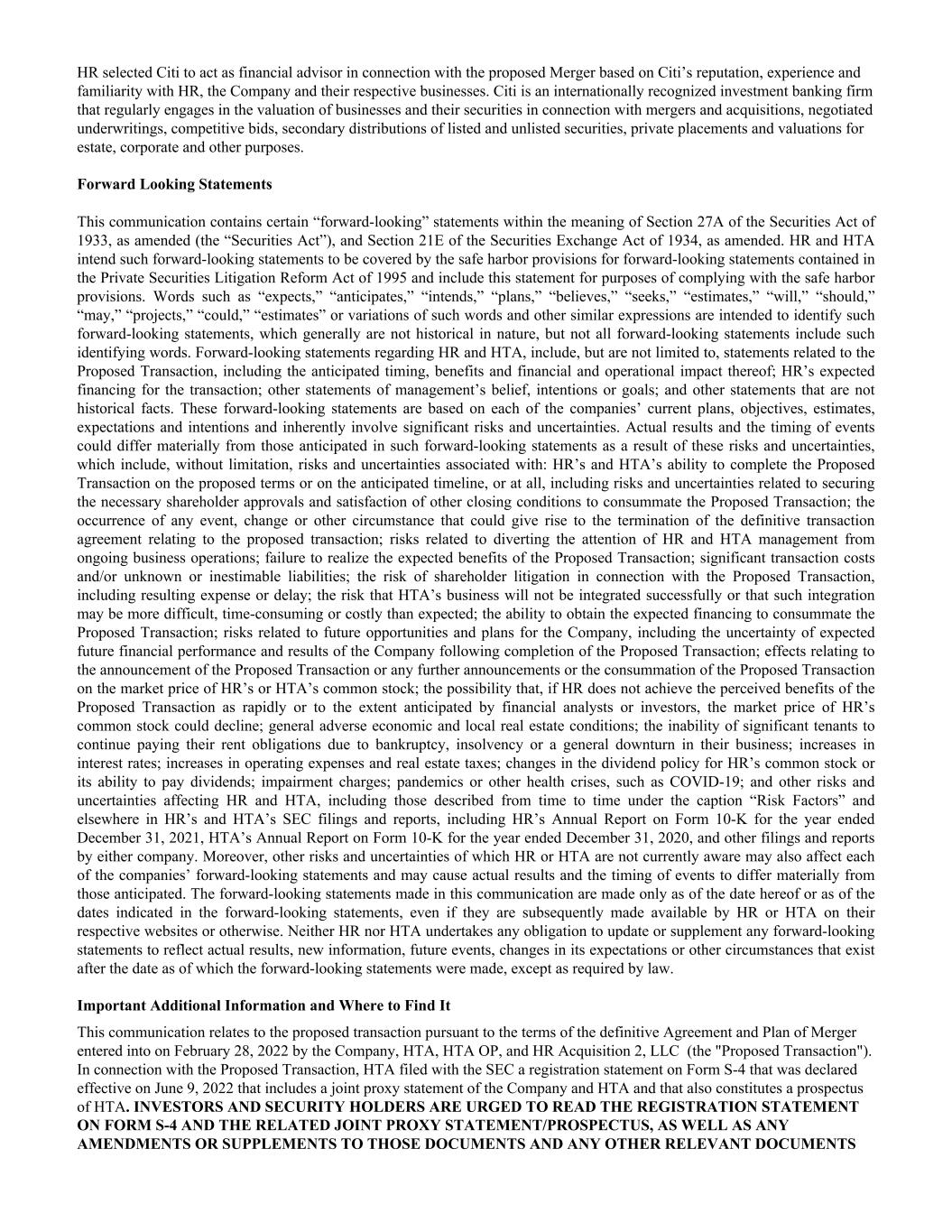 HR selected Citi to act as financial advisor in connection with the proposed Merger based on Citi’s reputation, experience and familiarity with HR, the Company and their respective businesses. Citi is an internationally recognized investment banking firm that regularly engages in the valuation of businesses and their securities in connection with mergers and acquisitions, negotiated underwritings, competitive bids, secondary distributions of listed and unlisted securities, private placements and valuations for estate, corporate and other purposes. Forward Looking Statements This communication contains certain “forward-looking” statements within the meaning of Section 27A of the Securities Act of 1933, as amended (the “Securities Act”), and Section 21E of the Securities Exchange Act of 1934, as amended. HR and HTA intend such forward-looking statements to be covered by the safe harbor provisions for forward-looking statements contained in the Private Securities Litigation Reform Act of 1995 and include this statement for purposes of complying with the safe harbor provisions. Words such as “expects,” “anticipates,” “intends,” “plans,” “believes,” “seeks,” “estimates,” “will,” “should,” “may,” “projects,” “could,” “estimates” or variations of such words and other similar expressions are intended to identify such forward-looking statements, which generally are not historical in nature, but not all forward-looking statements include such identifying words. Forward-looking statements regarding HR and HTA, include, but are not limited to, statements related to the Proposed Transaction, including the anticipated timing, benefits and financial and operational impact thereof; HR’s expected financing for the transaction; other statements of management’s belief, intentions or goals; and other statements that are not historical facts. These forward-looking statements are based on each of the companies’ current plans, objectives, estimates, expectations and intentions and inherently involve significant risks and uncertainties. Actual results and the timing of events could differ materially from those anticipated in such forward-looking statements as a result of these risks and uncertainties, which include, without limitation, risks and uncertainties associated with: HR’s and HTA’s ability to complete the Proposed Transaction on the proposed terms or on the anticipated timeline, or at all, including risks and uncertainties related to securing the necessary shareholder approvals and satisfaction of other closing conditions to consummate the Proposed Transaction; the occurrence of any event, change or other circumstance that could give rise to the termination of the definitive transaction agreement relating to the proposed transaction; risks related to diverting the attention of HR and HTA management from ongoing business operations; failure to realize the expected benefits of the Proposed Transaction; significant transaction costs and/or unknown or inestimable liabilities; the risk of shareholder litigation in connection with the Proposed Transaction, including resulting expense or delay; the risk that HTA’s business will not be integrated successfully or that such integration may be more difficult, time-consuming or costly than expected; the ability to obtain the expected financing to consummate the Proposed Transaction; risks related to future opportunities and plans for the Company, including the uncertainty of expected future financial performance and results of the Company following completion of the Proposed Transaction; effects relating to the announcement of the Proposed Transaction or any further announcements or the consummation of the Proposed Transaction on the market price of HR’s or HTA’s common stock; the possibility that, if HR does not achieve the perceived benefits of the Proposed Transaction as rapidly or to the extent anticipated by financial analysts or investors, the market price of HR’s common stock could decline; general adverse economic and local real estate conditions; the inability of significant tenants to continue paying their rent obligations due to bankruptcy, insolvency or a general downturn in their business; increases in interest rates; increases in operating expenses and real estate taxes; changes in the dividend policy for HR’s common stock or its ability to pay dividends; impairment charges; pandemics or other health crises, such as COVID-19; and other risks and uncertainties affecting HR and HTA, including those described from time to time under the caption “Risk Factors” and elsewhere in HR’s and HTA’s SEC filings and reports, including HR’s Annual Report on Form 10-K for the year ended December 31, 2021, HTA’s Annual Report on Form 10-K for the year ended December 31, 2020, and other filings and reports by either company. Moreover, other risks and uncertainties of which HR or HTA are not currently aware may also affect each of the companies’ forward-looking statements and may cause actual results and the timing of events to differ materially from those anticipated. The forward-looking statements made in this communication are made only as of the date hereof or as of the dates indicated in the forward-looking statements, even if they are subsequently made available by HR or HTA on their respective websites or otherwise. Neither HR nor HTA undertakes any obligation to update or supplement any forward-looking statements to reflect actual results, new information, future events, changes in its expectations or other circumstances that exist after the date as of which the forward-looking statements were made, except as required by law. Important Additional Information and Where to Find It This communication relates to the proposed transaction pursuant to the terms of the definitive Agreement and Plan of Merger entered into on February 28, 2022 by the Company, HTA, HTA OP, and