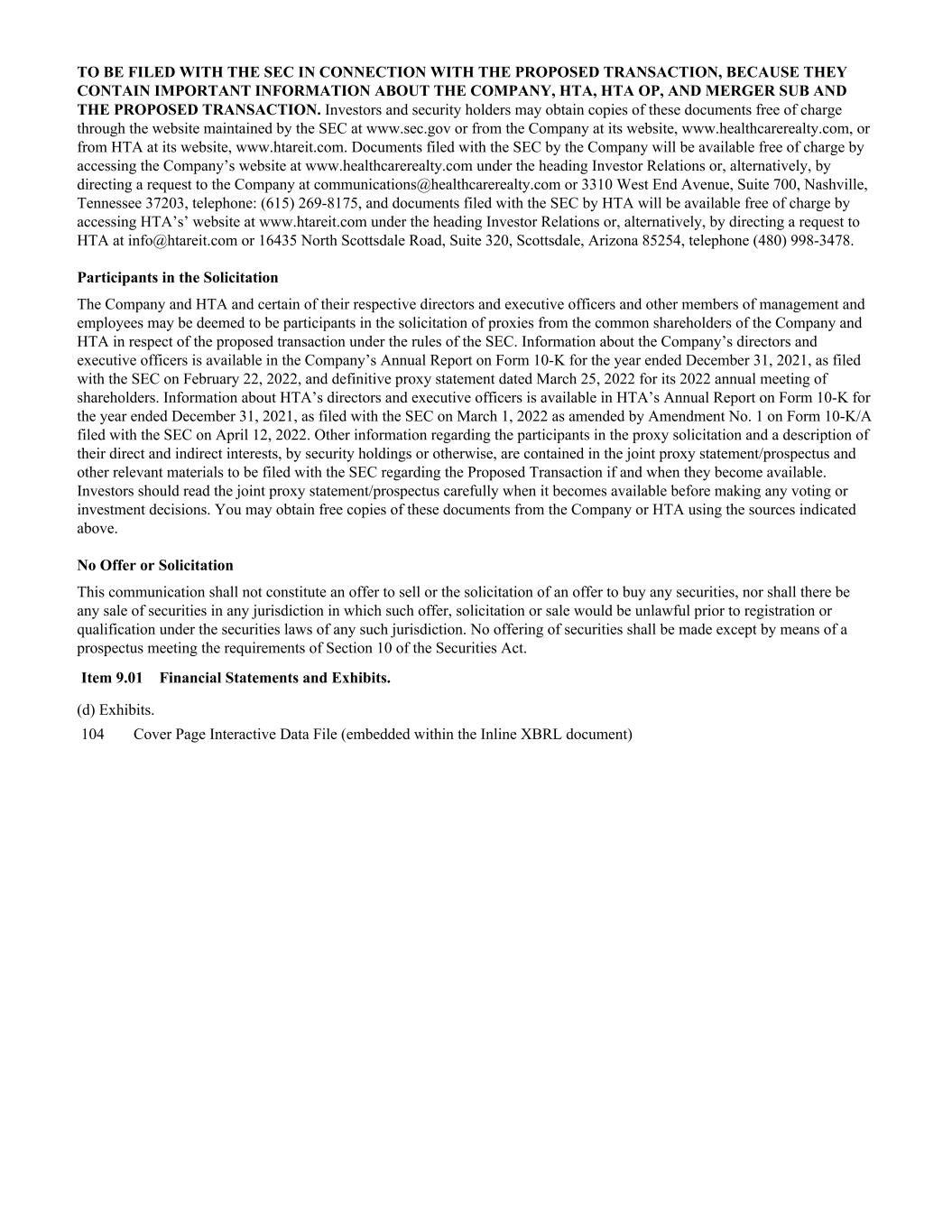 TO BE FILED WITH THE SEC IN CONNECTION WITH THE PROPOSED TRANSACTION, BECAUSE THEY CONTAIN IMPORTANT INFORMATION ABOUT THE COMPANY, HTA, HTA OP, AND MERGER SUB AND THE PROPOSED TRANSACTION. Investors and security holders may obtain copies of these documents free of charge through the website maintained by the SEC at www.sec.gov or from the Company at its website, www.healthcarerealty.com, or from HTA at its website, www.htareit.com. Documents filed with the SEC by the Company will be available free of charge by accessing the Company’s website at www.healthcarerealty.com under the heading Investor Relations or, alternatively, by directing a request to the Company at communications@healthcarerealty.com or 3310 West End Avenue, Suite 700, Nashville, Tennessee 37203, telephone: (615) 269-8175, and documents filed with the SEC by HTA will be available free of charge by accessing HTA’s’ website at www.htareit.com under the heading Investor Relations or, alternatively, by directing a request to HTA at info@htareit.com or 16435 North Scottsdale Road, Suite 320, Scottsdale, Arizona 85254, telephone (480) 998-3478. Participants in the Solicitation The Company and HTA and certain of their respective directors and executive officers and other members of management and employees may be deemed to be participants in the solicitation of proxies from the common shareholders of the Company and HTA in respect of the proposed transaction under the rules of the SEC. Information about the Company’s directors and executive officers is available in the Company’s Annual Report on Form 10-K for the year ended December 31, 2021, as filed with the SEC on February 22, 2022, and definitive proxy statement dated March 25, 2022 for its 2022 annual meeting of shareholders. Information about HTA’s directors and executive officers is available in HTA’s Annual Report on Form 10-K for the year ended December 31, 2021, as filed with the SEC on March 1, 2022 as amended by Amendment No. 1 on Form 10-K/A filed with the SEC on April 12, 2022. Other information regarding the participants in the proxy solicitation and a description of their direct and indirect interests, by security holdings or otherwise, are contained in the joint proxy statement/prospectus and other relevant materials to be filed with the SEC regarding the Proposed Transaction if and when they become available. Investors should read the joint proxy statement/prospectus carefully when it becomes available before making any voting or investment decisions. You may obtain free copies of these documents from the Company or HTA using the sources indicated above. No Offer or Solicitation This communication shall not constitute an offer to sell or the solicitation of an offer to buy any securities, nor shall there be any sale of securities in any jurisdiction in which such offer, solicitation or sale would be unlawful prior to registration or qualification under the securities laws of any such jurisdiction. No offering of securities shall be made except by means of a prospectus meeting the requirements of Section 10 of the Securities Act. Item 9.01 Financial Statements and Exhibits. (d) Exhibits. 104 Cover Page Interactive Data File (embedded within the Inline XBRL document)