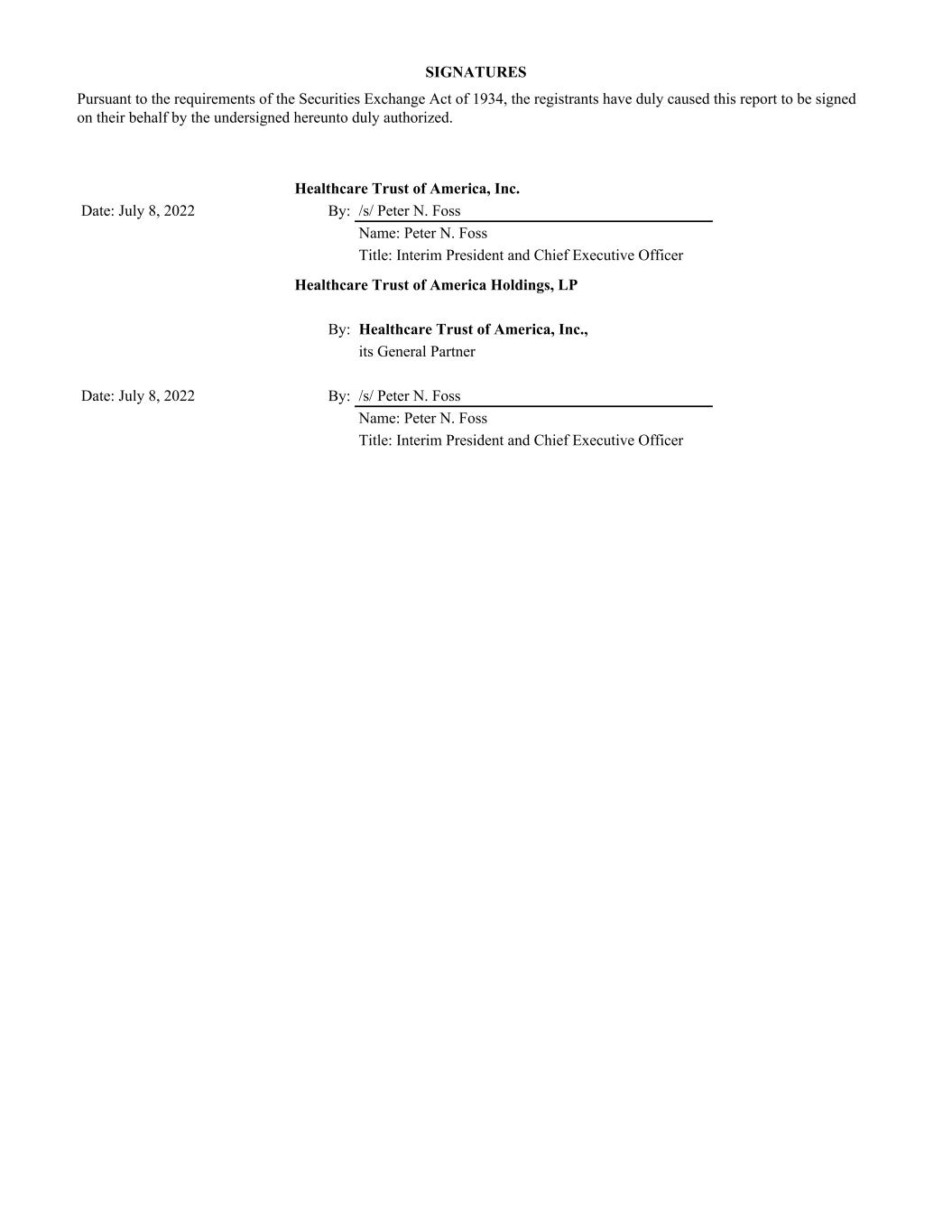 SIGNATURES Pursuant to the requirements of the Securities Exchange Act of 1934, the registrants have duly caused this report to be signed on their behalf by the undersigned hereunto duly authorized. Healthcare Trust of America, Inc. Date: July 8, 2022 By: /s/ Peter N. Foss Name: Peter N. Foss Title: Interim President and Chief Executive Officer Healthcare Trust of America Holdings, LP By: Healthcare Trust of America, Inc., its General Partner Date: July 8, 2022 By: /s/ Peter N. Foss Name: Peter N. Foss Title: Interim President and Chief Executive Officer