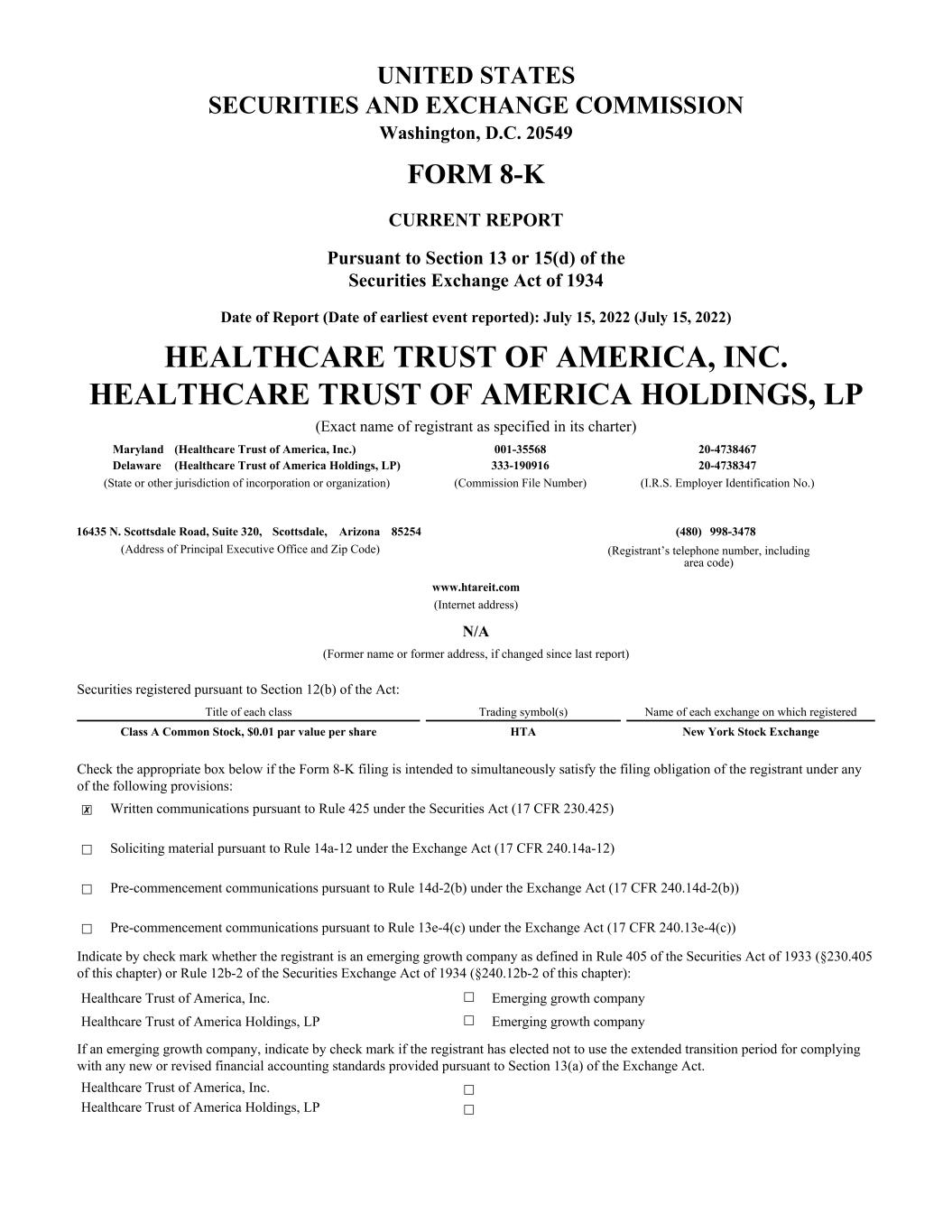 UNITED STATES SECURITIES AND EXCHANGE COMMISSION Washington, D.C. 20549 FORM 8-K CURRENT REPORT Pursuant to Section 13 or 15(d) of the Securities Exchange Act of 1934 Date of Report (Date of earliest event reported): July 15, 2022 (July 15, 2022) HEALTHCARE TRUST OF AMERICA, INC. HEALTHCARE TRUST OF AMERICA HOLDINGS, LP (Exact name of registrant as specified in its charter) Maryland (Healthcare Trust of America, Inc.) 001-35568 20-4738467 Delaware (Healthcare Trust of America Holdings, LP) 333-190916 20-4738347 (State or other jurisdiction of incorporation or organization) (Commission File Number) (I.R.S. Employer Identification No.) 16435 N. Scottsdale Road, Suite 320, Scottsdale, Arizona 85254 (480) 998-3478 (Address of Principal Executive Office and Zip Code) (Registrant’s telephone number, including area code) www.htareit.com (Internet address) N/A (Former name or former address, if changed since last report) Securities registered pursuant to Section 12(b) of the Act: Title of each class Trading symbol(s) Name of each exchange on which registered Class A Common Stock, $0.01 par value per share HTA New York Stock Exchange Check the appropriate box below if the Form 8-K filing is intended to simultaneously satisfy the filing obligation of the registrant under any of the following provisions: ☒ Written communications pursuant to Rule 425 under the Securities Act (17 CFR 230.425) ☐ Soliciting material pursuant to Rule 14a-12 under the Exchange Act (17 CFR 240.14a-12) ☐ Pre-commencement communications pursuant to Rule 14d-2(b) under the Exchange Act (17 CFR 240.14d-2(b)) ☐ Pre-commencement communications pursuant to Rule 13e-4(c) under the Exchange Act (17 CFR 240.13e-4(c)) Indicate by check mark whether the registrant is an emerging growth company as defined in Rule 405 of the Securities Act of 1933 (§230.405 of this chapter) or Rule 12b-2 of the Securities Exchange Act of 1934 (§240.12b-2 of this chapter): Healthcare Trust of America, Inc. ☐ Emerging growth company Healthcare Trust of America Holdings, LP ☐ Emerging growth company If an emerging growth company, indicate by check mark if the registrant has elected not to use the extended transition period for complying with any new or revised financial accounting standards provided pursuant to Section 13(a) of the Exchange Act. Healthcare Trust of America, Inc. ☐ Healthcare Trust of America Holdings, LP ☐