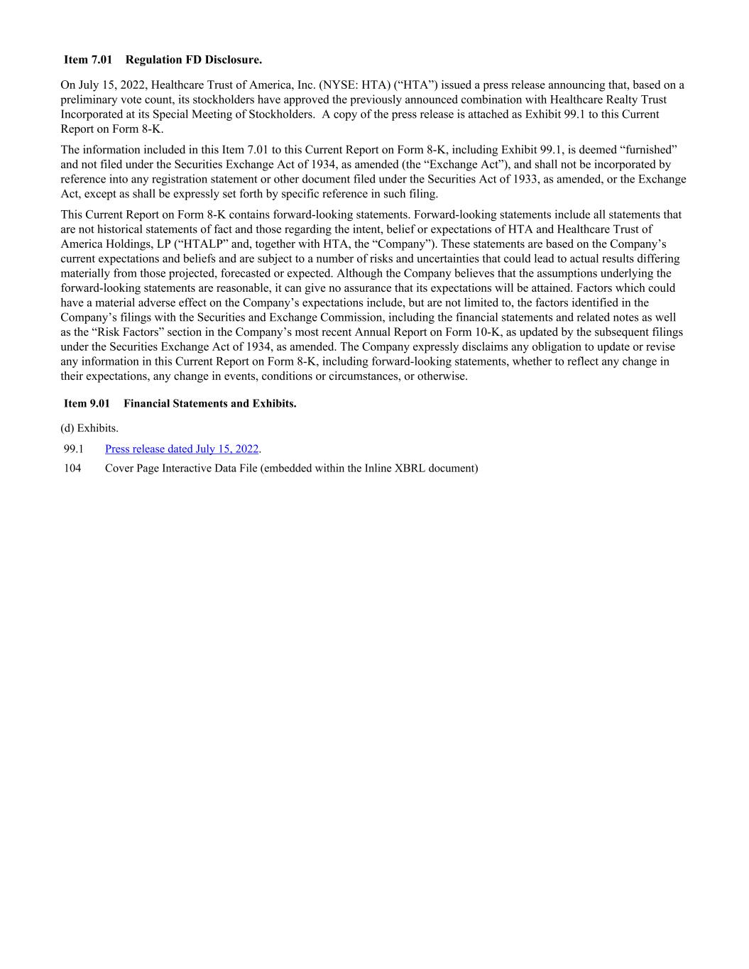 Item 7.01 Regulation FD Disclosure. On July 15, 2022, Healthcare Trust of America, Inc. (NYSE: HTA) (“HTA”) issued a press release announcing that, based on a preliminary vote count, its stockholders have approved the previously announced combination with Healthcare Realty Trust Incorporated at its Special Meeting of Stockholders. A copy of the press release is attached as Exhibit 99.1 to this Current Report on Form 8-K. The information included in this Item 7.01 to this Current Report on Form 8-K, including Exhibit 99.1, is deemed “furnished” and not filed under the Securities Exchange Act of 1934, as amended (the “Exchange Act”), and shall not be incorporated by reference into any registration statement or other document filed under the Securities Act of 1933, as amended, or the Exchange Act, except as shall be expressly set forth by specific reference in such filing. This Current Report on Form 8-K contains forward-looking statements. Forward-looking statements include all statements that are not historical statements of fact and those regarding the intent, belief or expectations of HTA and Healthcare Trust of America Holdings, LP (“HTALP” and, together with HTA, the “Company”). These statements are based on the Company’s current expectations and beliefs and are subject to a number of risks and uncertainties that could lead to actual results differing materially from those projected, forecasted or expected. Although the Company believes that the assumptions underlying the forward-looking statements are reasonable, it can give no assurance that its expectations will be attained. Factors which could have a material adverse effect on the Company’s expectations include, but are not limited to, the factors identified in the Company’s filings with the Securities and Exchange Commission, including the financial statements and related notes as well as the “Risk Factors” section in the Company’s most recent Annual Report on Form 10-K, as updated by the subsequent filings under the Securities Exchange Act of 1934, as amended. The Company expressly disclaims any obligation to update or revise any information in this Current Report on Form 8-K, including forward-looking statements, whether to reflect any change in their expectations, any change in events, conditions or circumstances, or otherwise. Item 9.01 Financial Statements and Exhibits. (d) Exhibits. 99.1 Press release dated July 15, 2022. 104 Cover Page Interactive Data File (embedded within the Inline XBRL document)