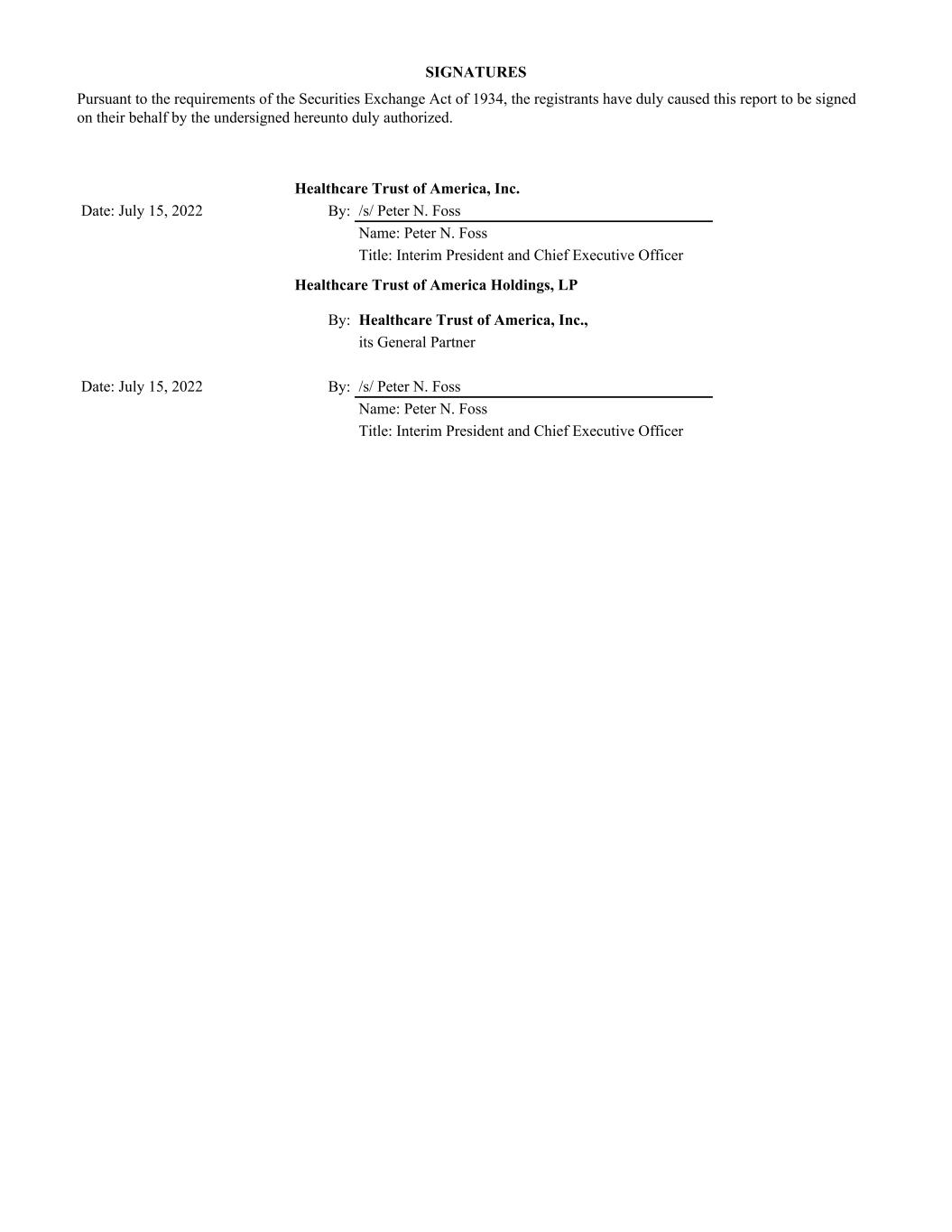 SIGNATURES Pursuant to the requirements of the Securities Exchange Act of 1934, the registrants have duly caused this report to be signed on their behalf by the undersigned hereunto duly authorized. Healthcare Trust of America, Inc. Date: July 15, 2022 By: /s/ Peter N. Foss Name: Peter N. Foss Title: Interim President and Chief Executive Officer Healthcare Trust of America Holdings, LP By: Healthcare Trust of America, Inc., its General Partner Date: July 15, 2022 By: /s/ Peter N. Foss Name: Peter N. Foss Title: Interim President and Chief Executive Officer