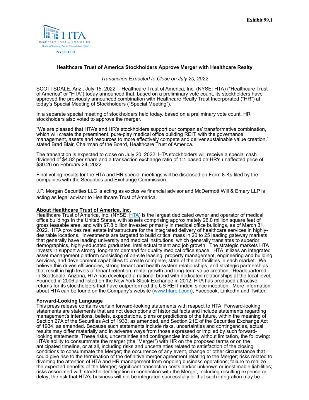 Exhibit 99.1 Healthcare Trust of America Stockholders Approve Merger with Healthcare Realty Transaction Expected to Close on July 20, 2022 SCOTTSDALE, Ariz., July 15, 2022 -- Healthcare Trust of America, Inc. (NYSE: HTA) ("Healthcare Trust of America" or "HTA") today announced that, based on a preliminary vote count, its stockholders have approved the previously announced combination with Healthcare Realty Trust Incorporated (“HR”) at today’s Special Meeting of Stockholders (“Special Meeting”). In a separate special meeting of stockholders held today, based on a preliminary vote count, HR stockholders also voted to approve the merger. “We are pleased that HTA’s and HR’s stockholders support our companies’ transformative combination, which will create the preeminent, pure-play medical office building REIT, with the governance, management, assets and resources to more effectively compete and deliver sustainable value creation,” stated Brad Blair, Chairman of the Board, Healthcare Trust of America. The transaction is expected to close on July 20, 2022. HTA stockholders will receive a special cash dividend of $4.82 per share and a transaction exchange ratio of 1:1 based on HR's unaffected price of $30.26 on February 24, 2022. Final voting results for the HTA and HR special meetings will be disclosed on Form 8-Ks filed by the companies with the Securities and Exchange Commission. J.P. Morgan Securities LLC is acting as exclusive financial advisor and McDermott Will & Emery LLP is acting as legal advisor to Healthcare Trust of America. About Healthcare Trust of America, Inc. Healthcare Trust of America, Inc. (NYSE: HTA) is the largest dedicated owner and operator of medical office buildings in the United States, with assets comprising approximately 26.0 million square feet of gross leasable area, and with $7.8 billion invested primarily in medical office buildings, as of March 31, 2022. HTA provides real estate infrastructure for the integrated delivery of healthcare services in highly- desirable locations. Investments are targeted to build critical mass in 20 to 25 leading gateway markets that generally have leading university and medical institutions, which generally translates to superior demographics, highly-educated graduates, intellectual talent and job growth. The strategic markets HTA invests in support a strong, long-term demand for quality medical office space. HTA utilizes an integrated asset management platform consisting of on-site leasing, property management, engineering and building services, and development capabilities to create complete, state of the art facilities in each market. We believe this drives efficiencies, strong tenant and health system relationships, and strategic partnerships that result in high levels of tenant retention, rental growth and long-term value creation. Headquartered in Scottsdale, Arizona, HTA has developed a national brand with dedicated relationships at the local level. Founded in 2006 and listed on the New York Stock Exchange in 2012, HTA has produced attractive returns for its stockholders that have outperformed the US REIT index, since inception. More information about HTA can be found on the Company's website (www.htareit.com), Facebook, LinkedIn and Twitter. Forward-Looking Language This press release contains certain forward-looking statements with respect to HTA. Forward-looking statements are statements that are not descriptions of historical facts and include statements regarding management’s intentions, beliefs, expectations, plans or predictions of the future, within the meaning of Section 27A of the Securities Act of 1933, as amended, and Section 21E of the Securities Exchange Act of 1934, as amended. Because such statements include risks, uncertainties and contingencies, actual results may differ materially and in adverse ways from those expressed or implied by such forward- looking statements. These risks, uncertainties and contingencies include, without limitation, the following: HTA’s ability to consummate the merger (the “Merger”) with HR on the proposed terms or on the anticipated timeline, or at all, including risks and uncertainties related to satisfaction of the closing conditions to consummate the Merger; the occurrence of any event, change or other circumstance that could give rise to the termination of the definitive merger agreement relating to the Merger; risks related to diverting the attention of HTA and HR management from ongoing business operations; failure to realize the expected benefits of the Merger; significant transaction costs and/or unknown or inestimable liabilities; risks associated with stockholder litigation in connection with the Merger, including resulting expense or delay; the risk that HTA’s business will not be integrated successfully or that such integration may be