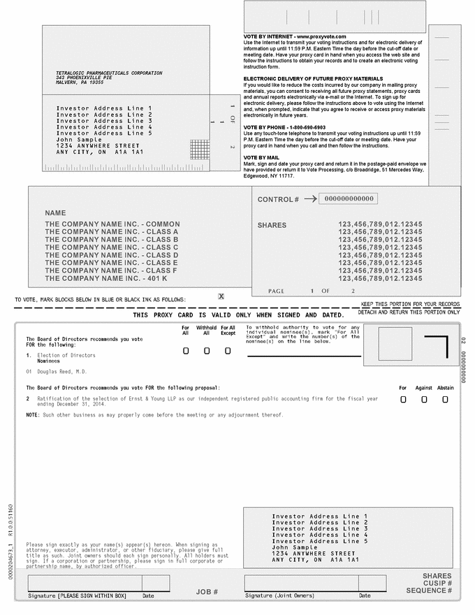| 1 1 12345678 12345678 12345678 12345678 12345678 12345678 12345678 12345678 000000000000 NAME THE COMPANY NAME INC. - COMMON 123,456,789,012.12345 THE COMPANY NAME INC. - CLASS A 123,456,789,012.12345 THE COMPANY NAME INC. - CLASS B 123,456,789,012.12345 THE COMPANY NAME INC. - CLASS C 123,456,789,012.12345 THE COMPANY NAME INC. - CLASS D 123,456,789,012.12345 THE COMPANY NAME INC. - CLASS E 123,456,789,012.12345 THE COMPANY NAME INC. - CLASS F 123,456,789,012.12345 THE COMPANY NAME INC. - 401 K 123,456,789,012.12345 . x 02 0000000000 JOB # 1 OF 2 1 OF 2 PAGE SHARES CUSIP # SEQUENCE # THIS PROXY CARD IS VALID ONLY WHEN SIGNED AND DATED. KEEP THIS PORTION FOR YOUR RECORDS DETACH AND RETURN THIS PORTION ONLY TO VOTE, MARK BLOCKS BELOW IN BLUE OR BLACK INK AS FOLLOWS: Signature (Joint Owners) Signature [PLEASE SIGN WITHIN BOX] Date Date CONTROL # SHARES To withhold authority to vote for any individual nominee(s), mark “For All Except” and write the number(s) of the nominee(s) on the line below. 0 0 0 0 0 0 0000204673_1 R1.0.0.51160 For Withhold For All All All Except The Board of Directors recommends you vote FOR the following: 1. Election of Directors Nominees 01 Douglas Reed, M.D. TETRALOGIC PHARMACEUTICALS CORPORATION 343 PHOENIXVILLE PIE MALVERN, PA 19355 Investor Address Line 1 Investor Address Line 2 Investor Address Line 3 Investor Address Line 4 Investor Address Line 5 John Sample 1234 ANYWHERE STREET ANY CITY, ON A1A 1A1 Investor Address Line 1 Investor Address Line 2 Investor Address Line 3 Investor Address Line 4 Investor Address Line 5 John Sample 1234 ANYWHERE STREET ANY CITY, ON A1A 1A1 VOTE BY INTERNET - www.proxyvote.com Use the Internet to transmit your voting instructions and for electronic delivery of information up until 11:59 P.M. Eastern Time the day before the cut-off date or meeting date. Have your proxy card in hand when you access the web site and follow the instructions to obtain your records and to create an electronic voting instruction form. ELECTRONIC DELIVERY OF FUTURE PROXY MATERIALS If you would like to reduce the costs incurred by our company in mailing proxy materials, you can consent to receiving all future proxy statements, proxy cards and annual reports electronically via e-mail or the Internet. To sign up for electronic delivery, please follow the instructions above to vote using the Internet and, when prompted, indicate that you agree to receive or access proxy materials electronically in future years. VOTE BY PHONE - 1-800-690-6903 Use any touch-tone telephone to transmit your voting instructions up until 11:59 P.M. Eastern Time the day before the cut-off date or meeting date. Have your proxy card in hand when you call and then follow the instructions. VOTE BY MAIL Mark, sign and date your proxy card and return it in the postage-paid envelope we have provided or return it to Vote Processing, c/o Broadridge, 51 Mercedes Way, Edgewood, NY 11717. The Board of Directors recommends you vote FOR the following proposal: For Against Abstain 2 Ratification of the selection of Ernst & Young LLP as our independent registered public accounting firm for the fiscal year ending December 31, 2014. NOTE: Such other business as may properly come before the meeting or any adjournment thereof. Please sign exactly as your name(s) appear(s) hereon. When signing as attorney, executor, administrator, or other fiduciary, please give full title as such. Joint owners should each sign personally. All holders must sign. If a corporation or partnership, please sign in full corporate or partnership name, by authorized officer. |