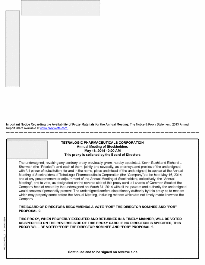 | 0000204673_2 R1.0.0.51160 Important Notice Regarding the Availability of Proxy Materials for the Annual Meeting: The Notice & Proxy Statement, 2013 Annual Report is/are available at www.proxyvote.com . TETRALOGIC PHARMACEUTICALS CORPORATION Annual Meeting of Stockholders May 16, 2014 10:00 AM This proxy is solicited by the Board of Directors The undersigned, revoking any contrary proxy previously given, hereby appoints J. Kevin Buchi and Richard L. Sherman (the "Proxies"), and each of them, jointly and severally, as attorneys and proxies of the undersigned, with full power of substitution, for and in the name, place and stead of the undersigned, to appear at the Annual Meeting of Stockholders of TetraLogic Pharmaceuticals Corporation (the "Company") to be held May 16, 2014, and at any postponement or adjournment of the Annual Meeting of Stockholders, collectively, the "Annual Meeting", and to vote, as designated on the reverse side of this proxy card, all shares of Common Stock of the Company held of record by the undersigned on March 31, 2014 with all the powers and authority the undersigned would possess if personally present. The undersigned confers discretionary authority by this proxy as to matters which may properly come before the Annual Meeting, including matters which are not timely made known to the Company. THE BOARD OF DIRECTORS RECOMMENDS A VOTE "FOR" THE DIRECTOR NOMINEE AND "FOR" PROPOSAL 2. THIS PROXY, WHEN PROPERLY EXECUTED AND RETURNED IN A TIMELY MANNER, WILL BE VOTED AS SPECIFIED ON THE REVERSE SIDE OF THIS PROXY CARD. IF NO DIRECTION IS SPECIFIED, THIS PROXY WILL BE VOTED "FOR" THE DIRECTOR NOMINEE AND "FOR" PROPOSAL 2. Continued and to be signed on reverse side |