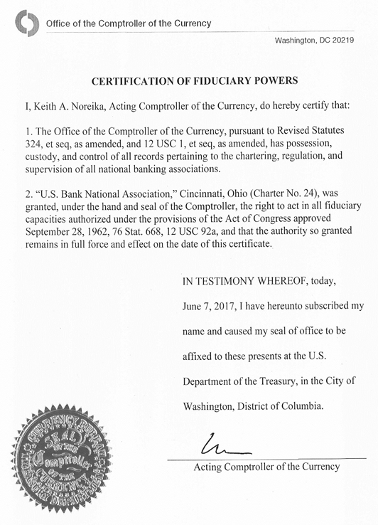 3. A copy of the certificate of authority of the Trustee to exercise corporate trust powers, attached as Exhibit 3.