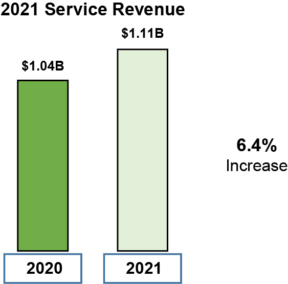 Service revenue increased 6.4% year-over-year to $1.11 billion, from $1.04 billion in 2020. |