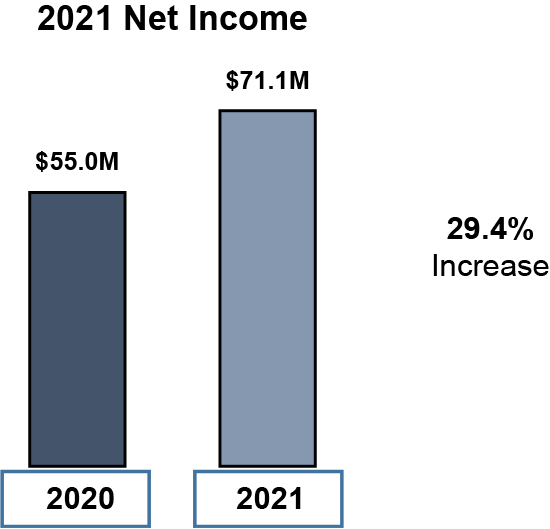 2021 net income was $71.1 million, an increase of 29.4% over $55.0 million in 2020. |