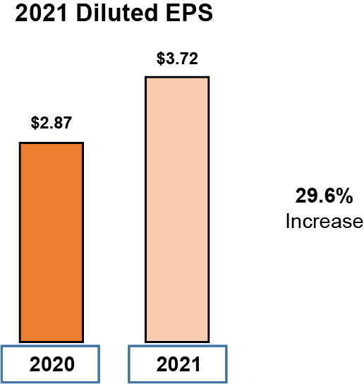 Diluted earnings per share (“EPS”) was up 29.6% to $3.72 in 2021 compared to $2.87 in 2020, of which $0.57 represented tax-effected facility and mergers & acquisitions-related charges. |