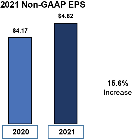 Non-GAAP EPS increased 15.6% from $4.17 in 2020 to $4.82 in 2021. Non-GAAP EPS represents diluted EPS, excluding the impact of certain items such as special charges and acquisition expenses that are not indicative of the performance of our ongoing operations, and the impact of amortization of intangible assets related to acquisitions and income tax effects. Non-GAAP EPS differs from other similar non-GAAP EPS measures for annual incentive plans (see Annex A) and performance shares (see Annex B). A reconciliation of this non-GAAP EPS can be found on Page 44 of the 2021 Form 10-K. |