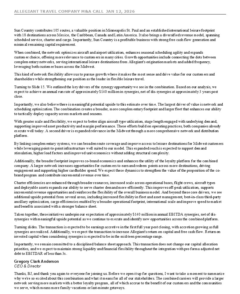 Airlines Holdings, Inc. (“Sun Country”) on January 12, 2026 at 8:30 a.m. ET regarding the acquisition of Sun Country by Allegiant: