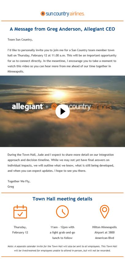 The following communication regarding the acquisition of Sun Country Airlines Holdings, Inc. (“Sun Country”) by Allegiant Travel Company (“Allegiant”) was sent from Greg Anderson, CEO of Allegiant, to employees of Sun