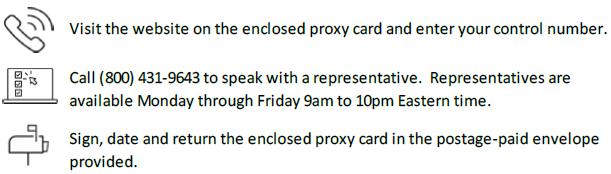 If you vote now, you will ensure your shares are represented and we will not contact you further on this issue. Detailed information about the Special Meeting and the proposal can be found in the Proxy Statement. If you have any questions about the proposal, contact your financial advisor, client service representative or AST Fund Solutions at (800) 431-9643.